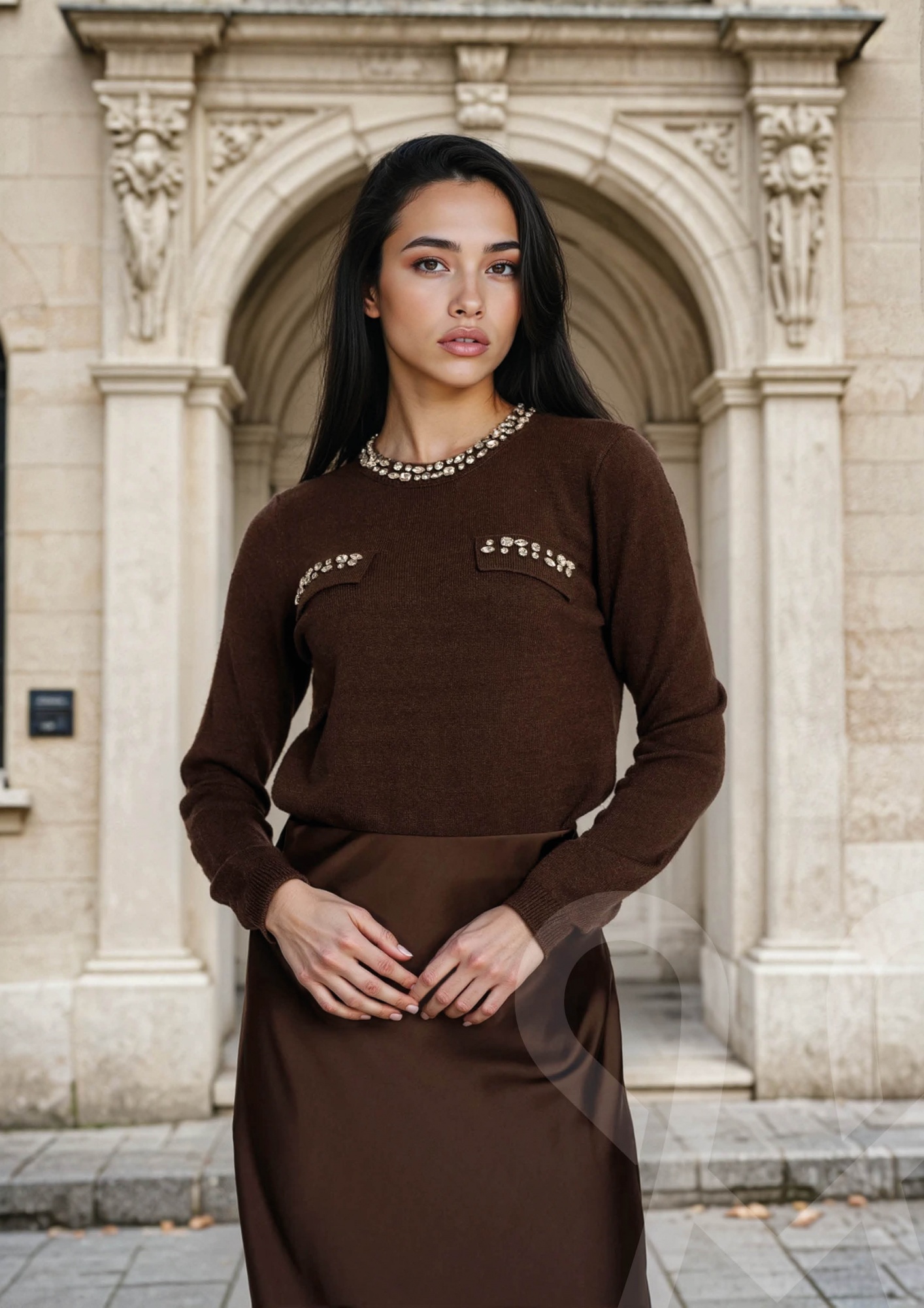 Barna színű, Magenta kötött pulóver, nyakán és elején strasszkövekkel díszített. Oldalán rávarrt textil Magenta márkajelzés. A pulóver egyméret méretben készült.