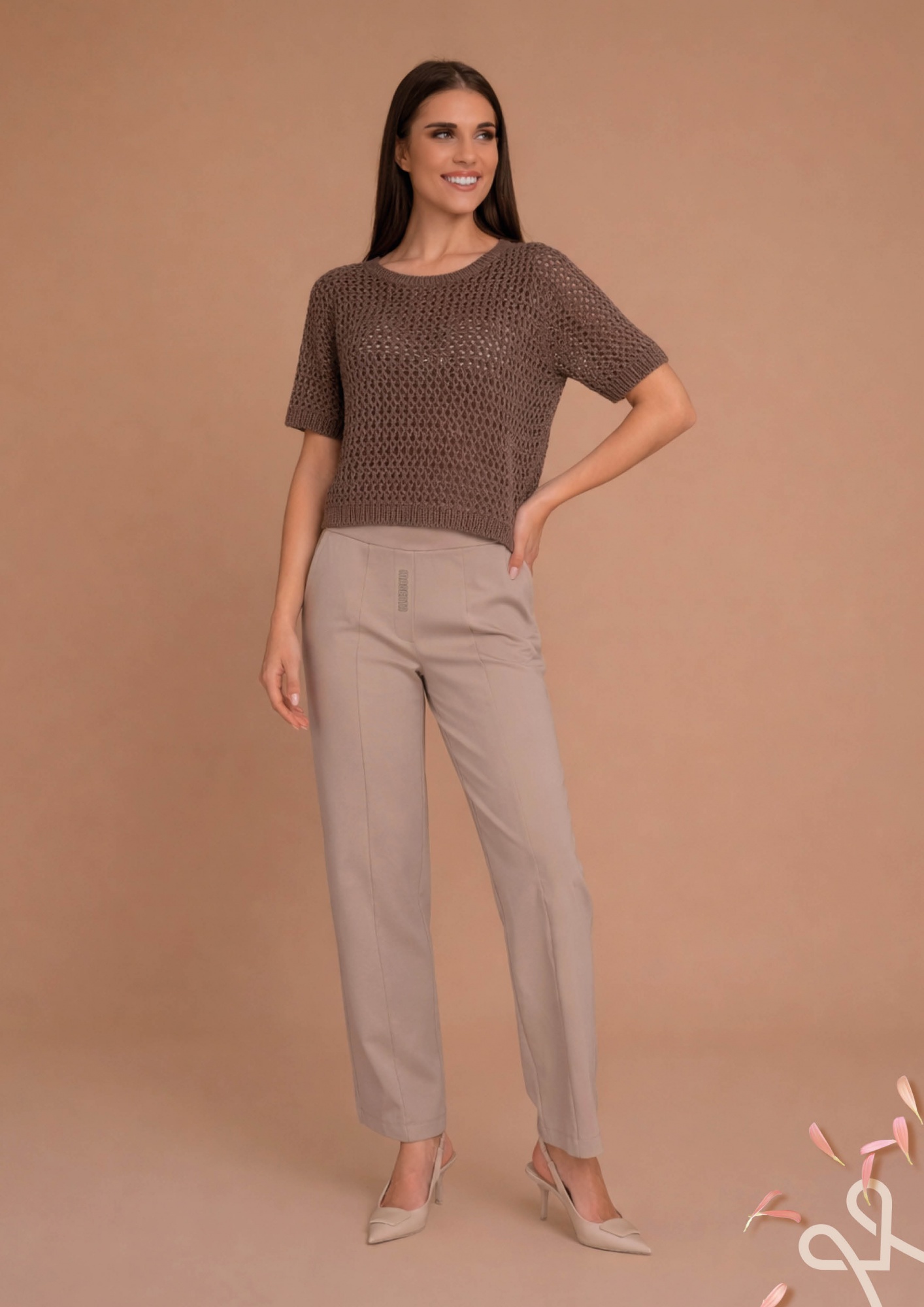 Elasztikus kötött anyagból készült, laza szabásvonalú, barna színű felső.