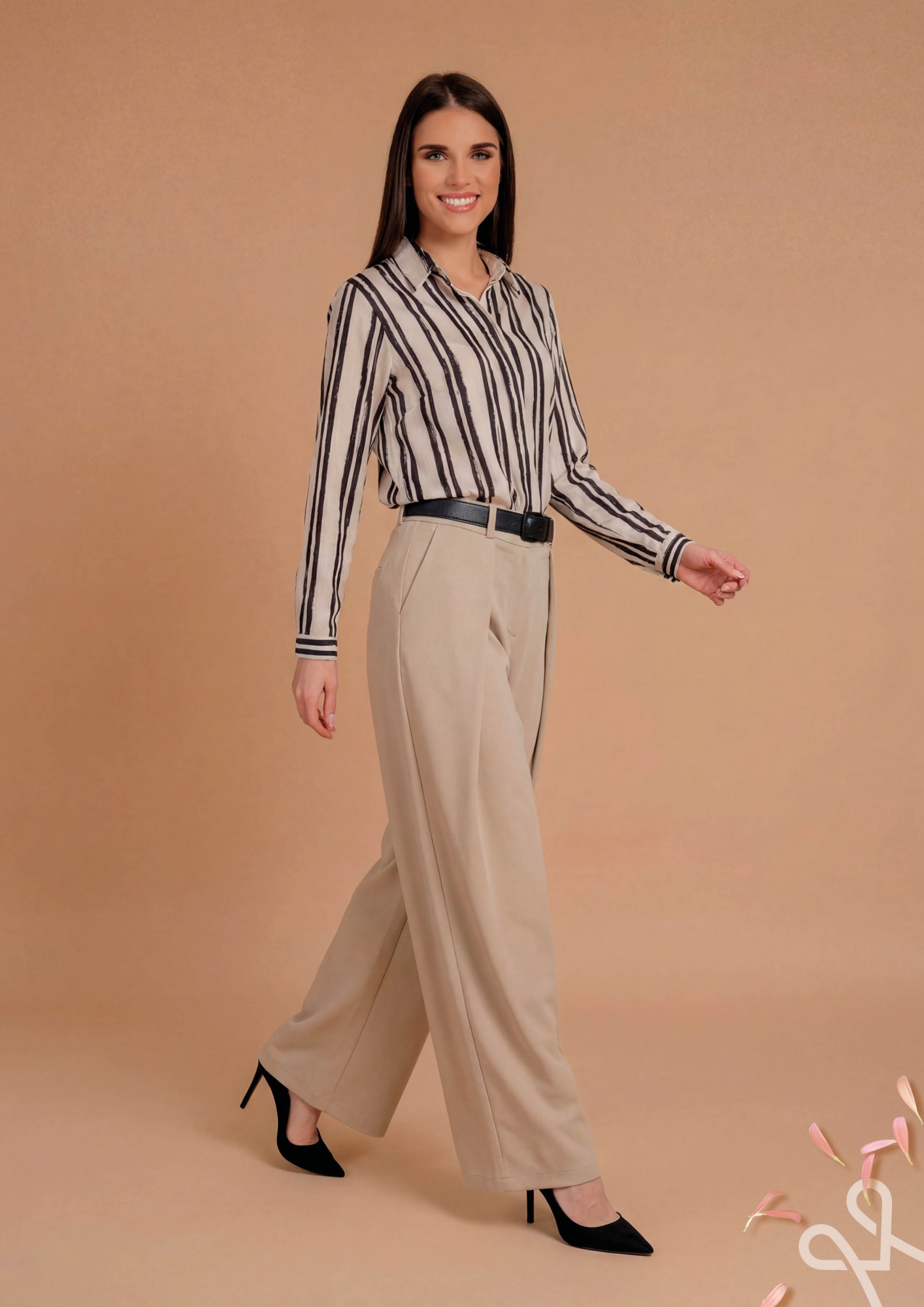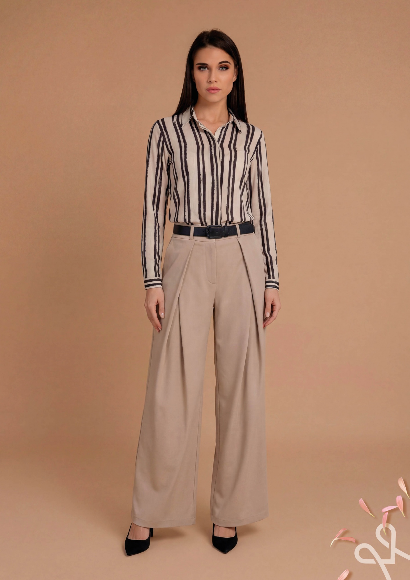 Bézs színű, bővebb szabású női nadrág jó esésű polyester anyagból, elején hajtásos részlettel, gombos-cipzáras záródással és oldalzsebekkel, amely elegáns és stílusos tavaszi viseletet biztosít.