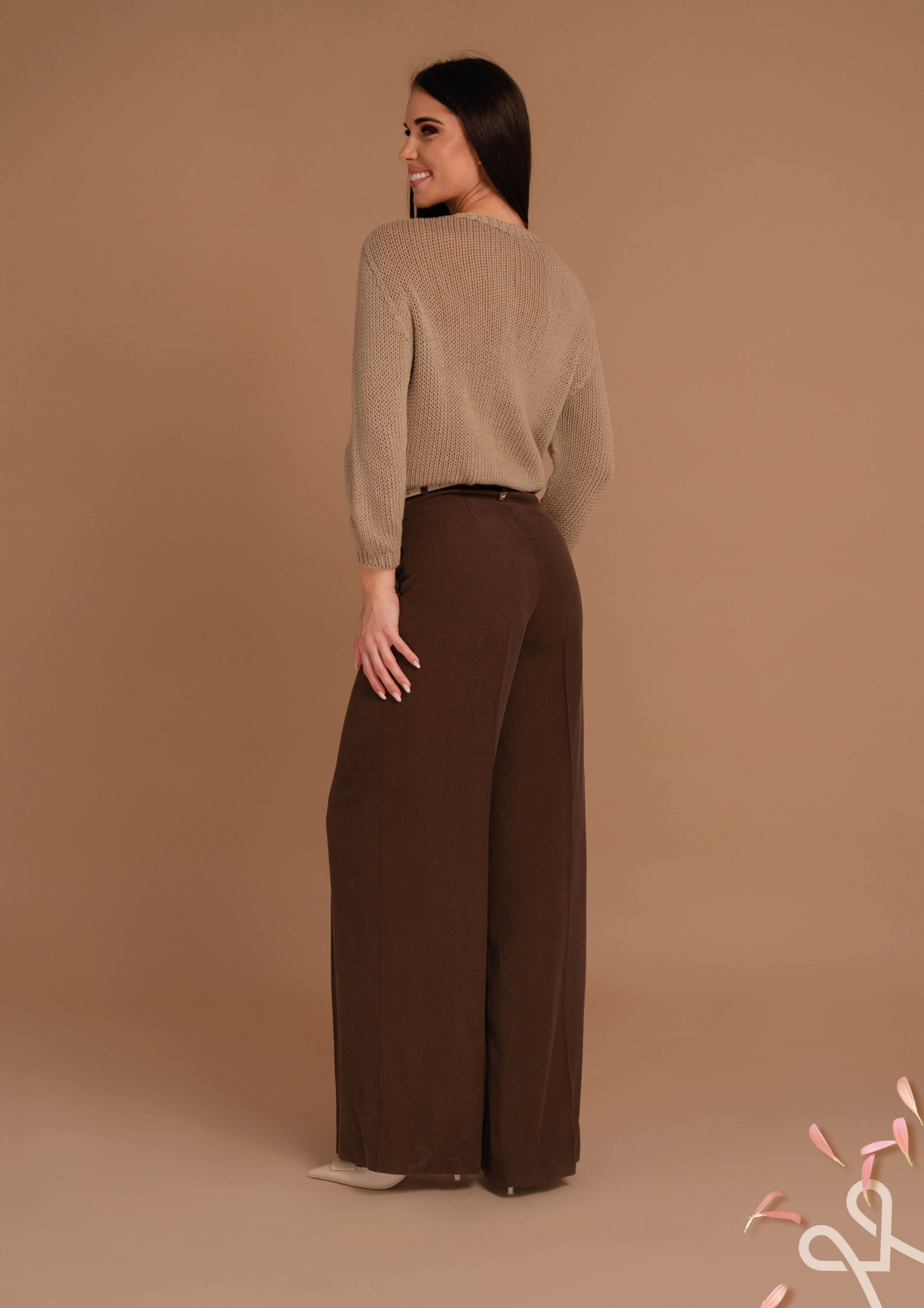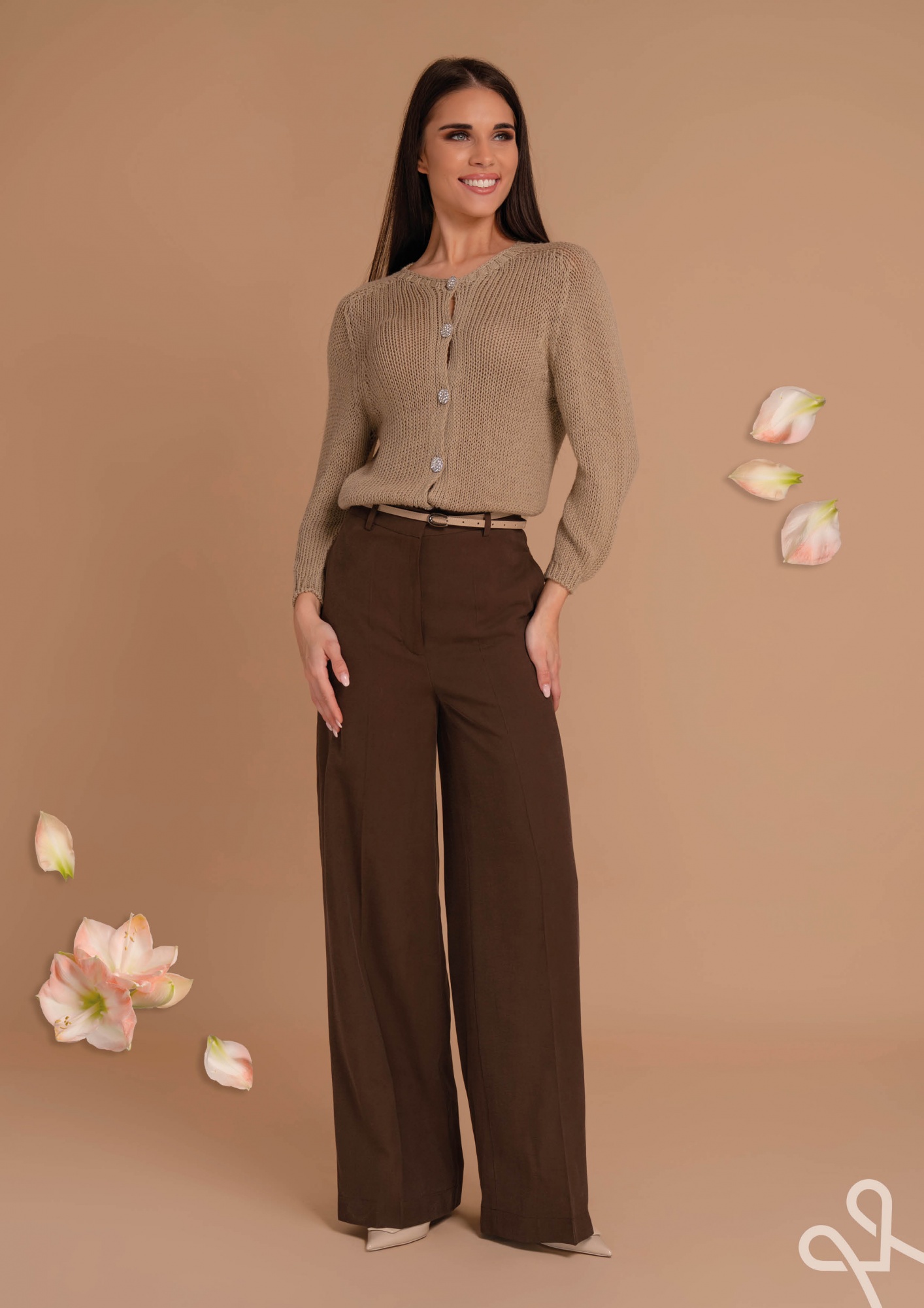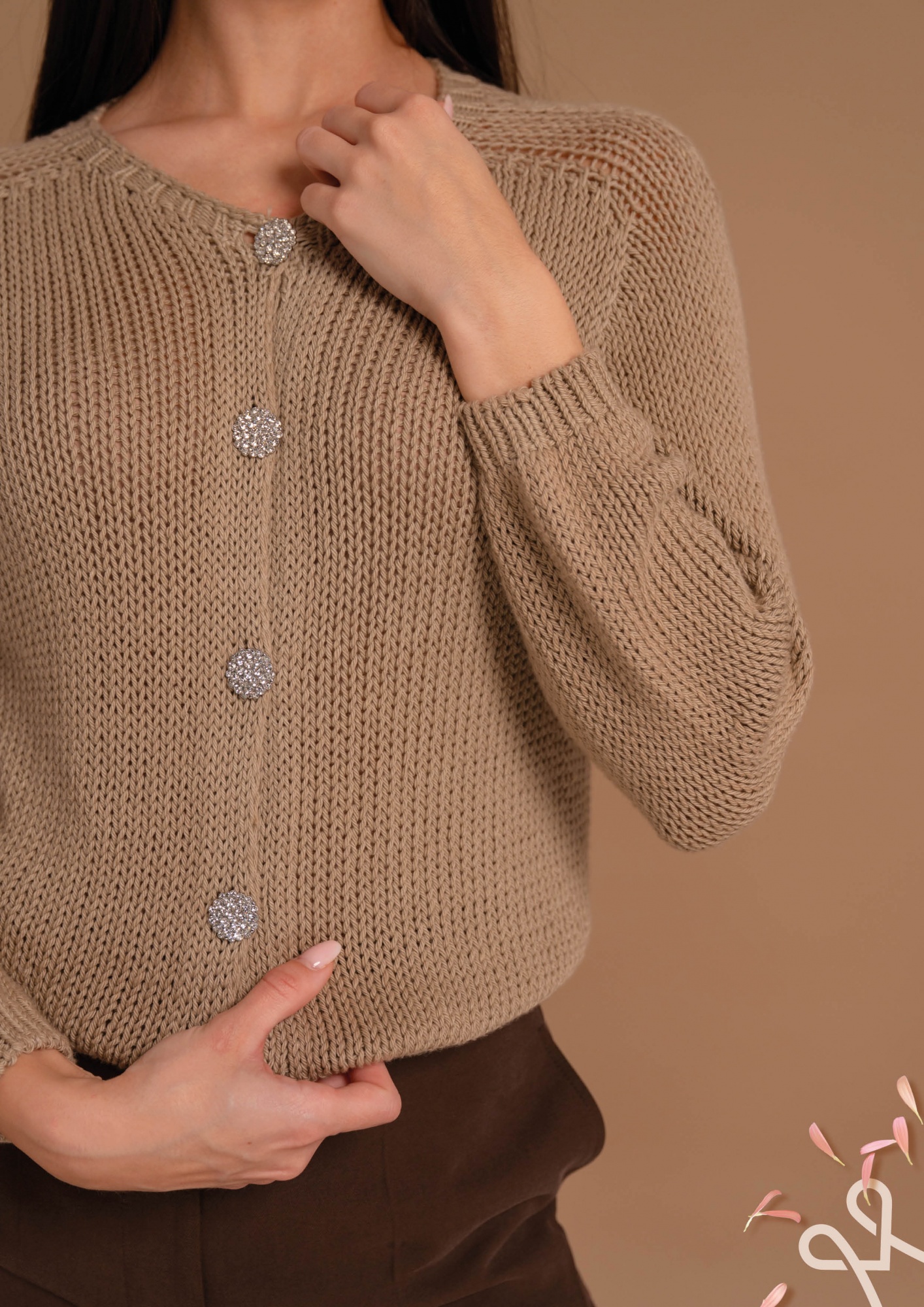 Bézs színű, szűkebb, alakot követő női kötött kardigán elől gombos záródással, kerek nyakkal és hosszú ujjal, amely elegáns és stílusos tavaszi viseletet biztosít.