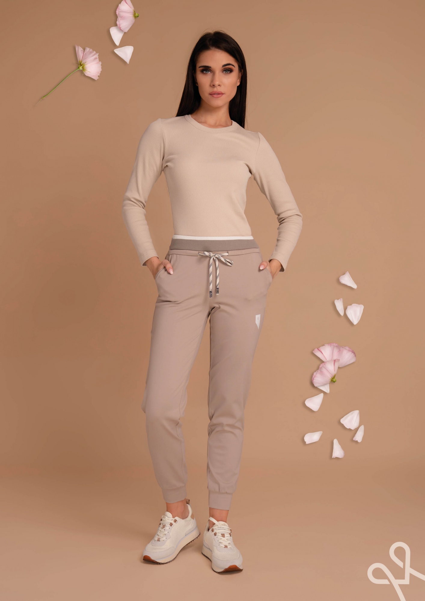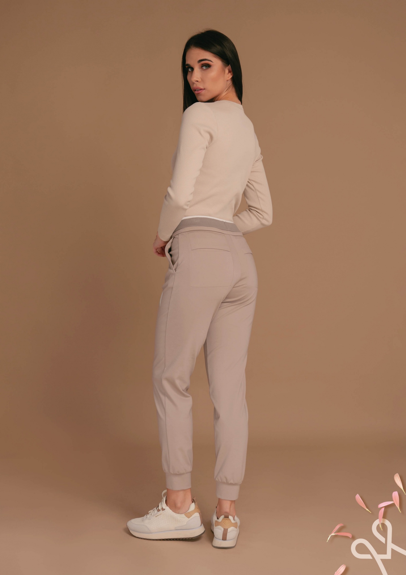 Bézs színű, szűkebb fazonú női puntó nadrág alján passzés, derekán gumirozott és megkötős, oldalán zsebekkel, amely kényelmes és stílusos tavaszi viselet.