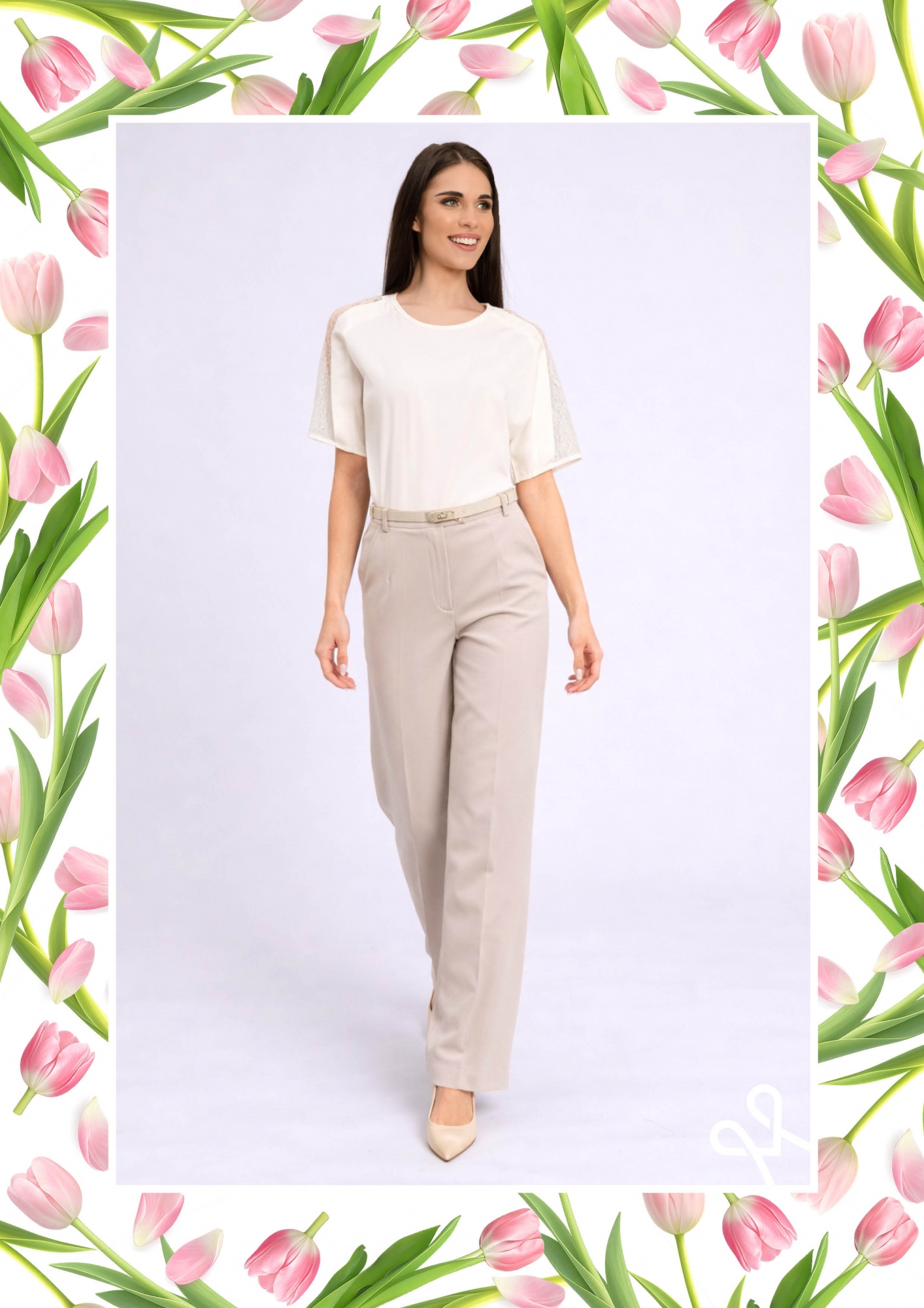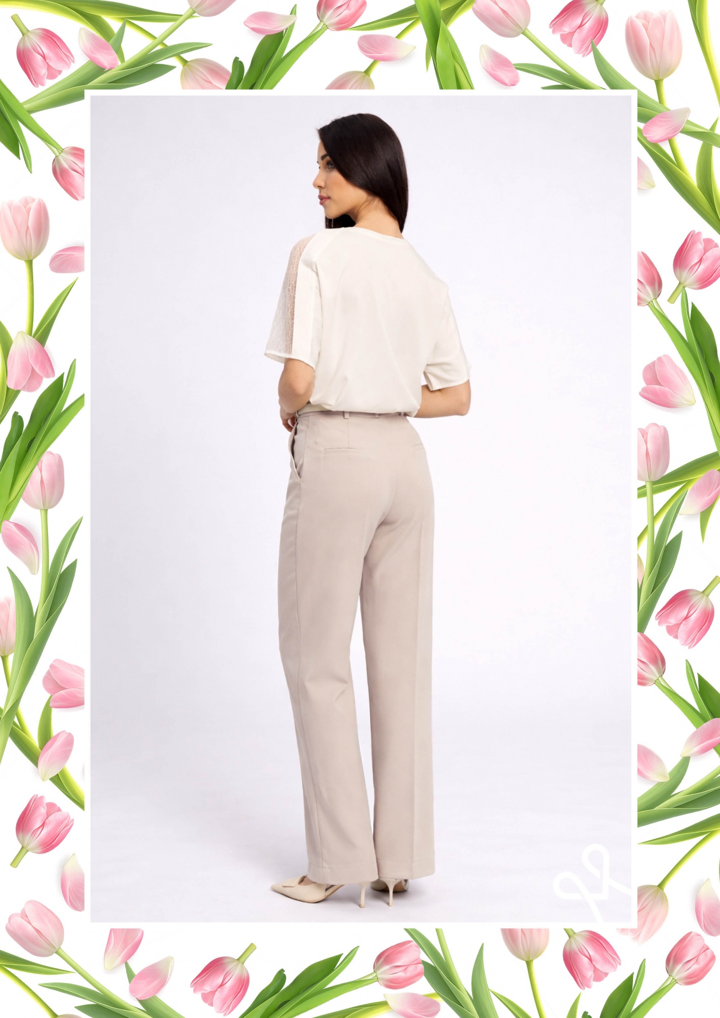 Egyenes szárú, kevert szálas nyári nadrág cipzáras-gombos záródással, oldalzsebekkel, élvasalt szárakkal és övbújtatóval bézs színben a stílusos, elegáns nyári megjelenésért.