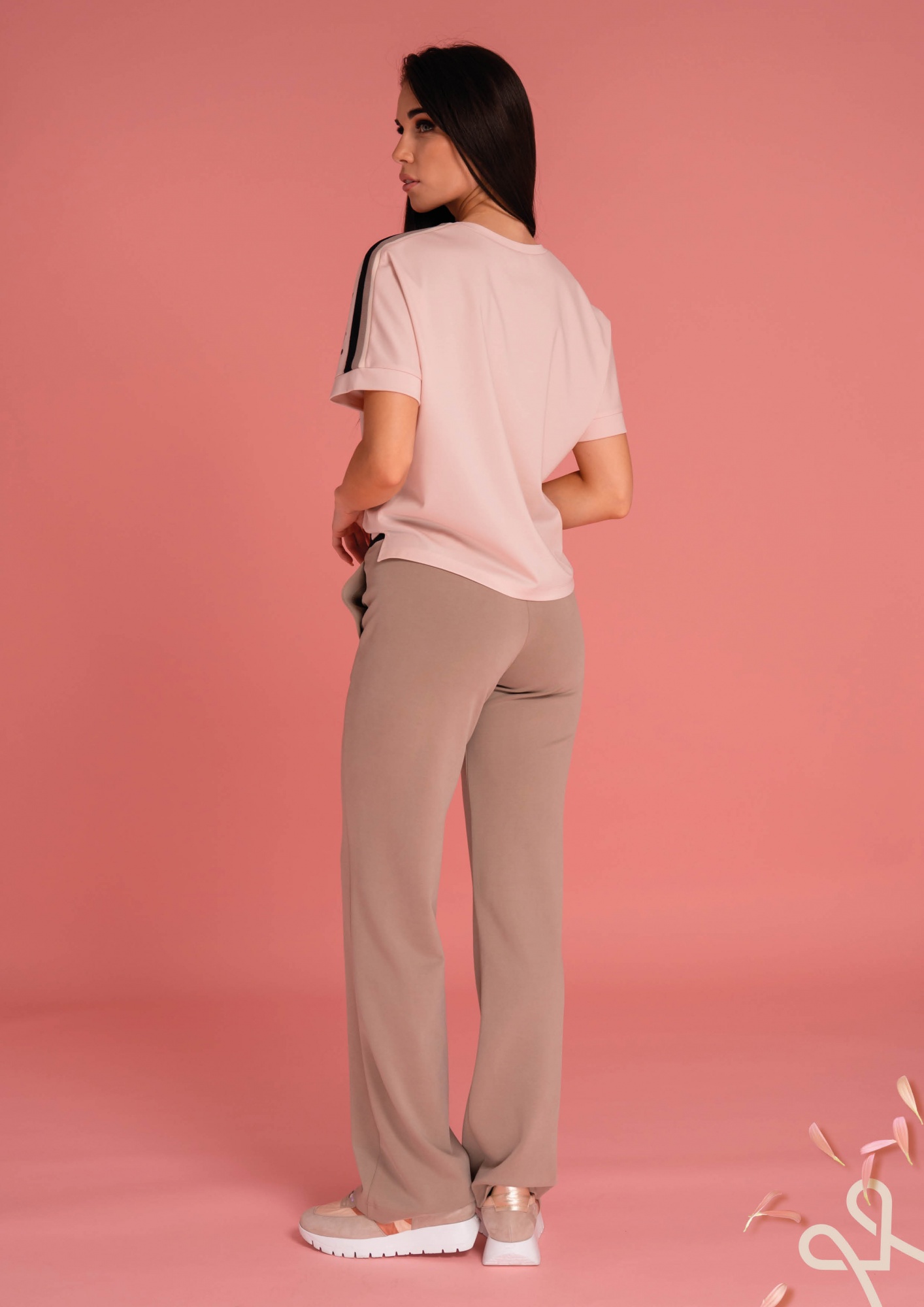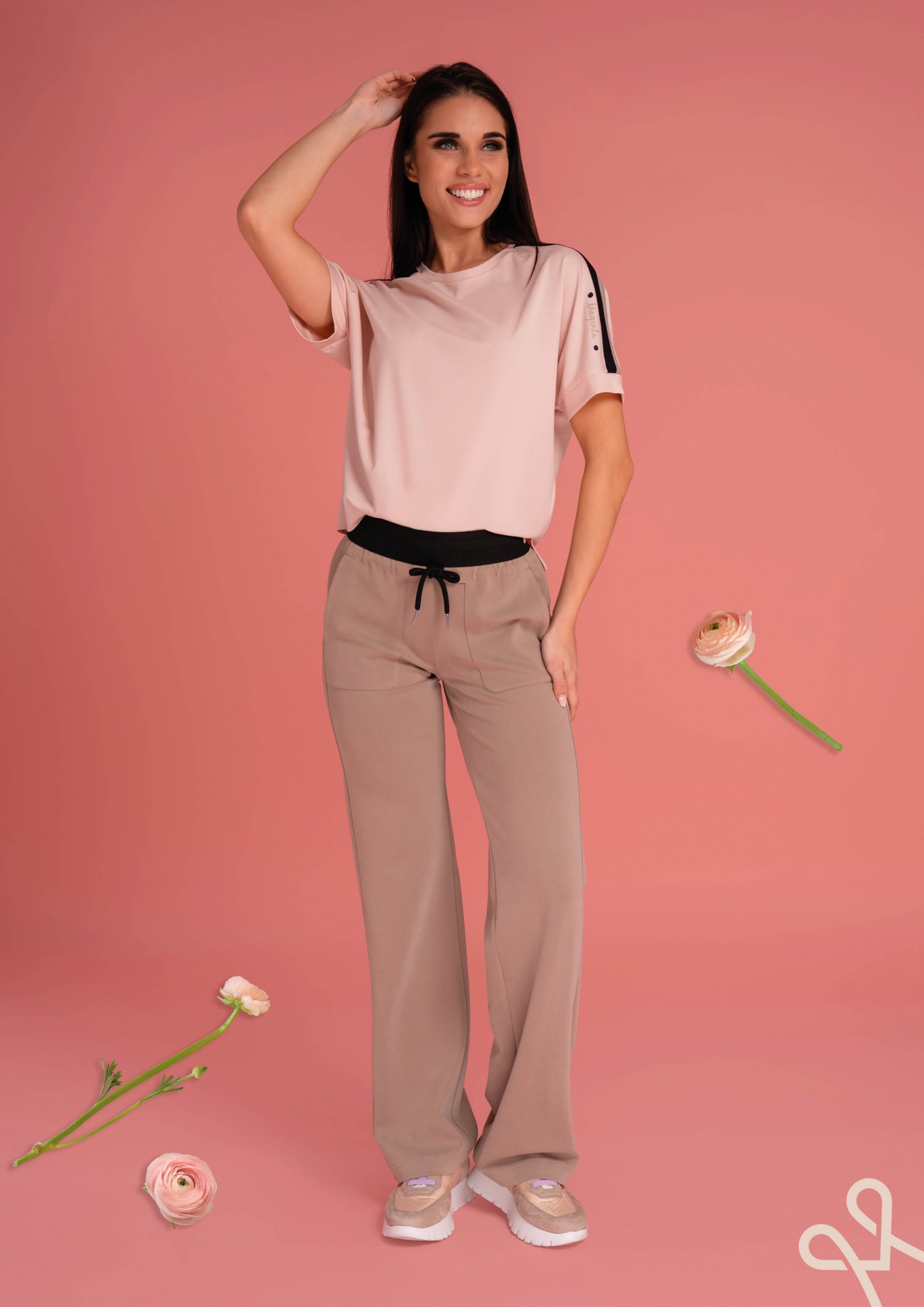 Bézs színű, sportos fazonú, egyenes szárú női nadrág gumis derékrésszel, elől megkötővel, oldalzsebekkel és filmnyomással díszítve, amely kényelmes, stílusos tavaszi viseletet biztosít.
