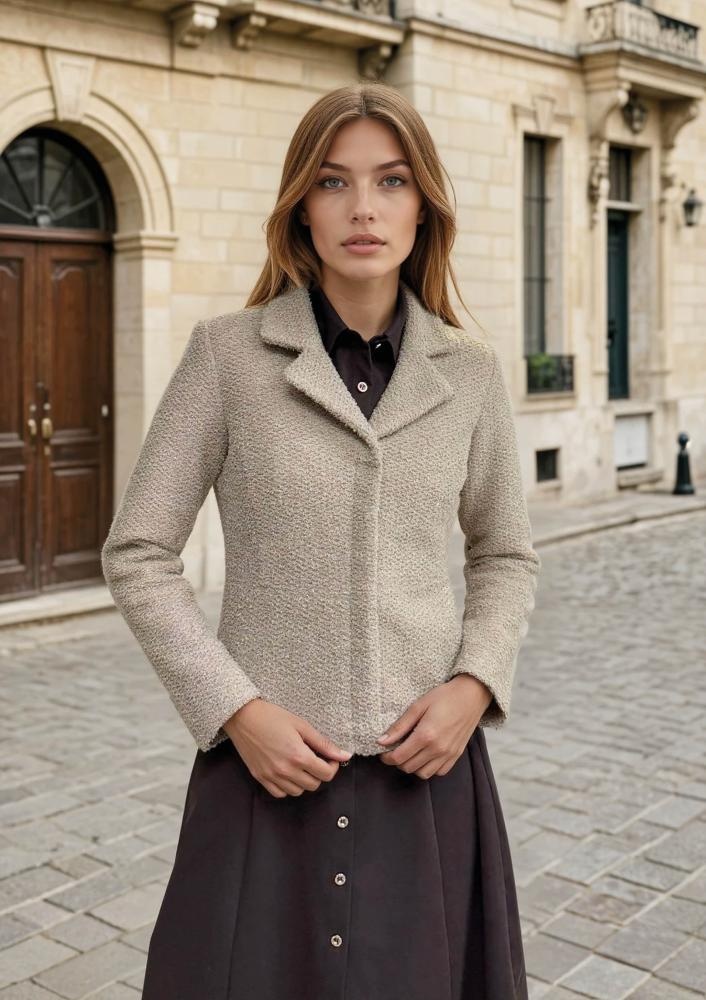Elegáns, szűkebb fazonú bézs zakó kevert szálas anyagból, fazonos gallérral és cipzáras előlappal a modern, kifinomult megjelenésért.