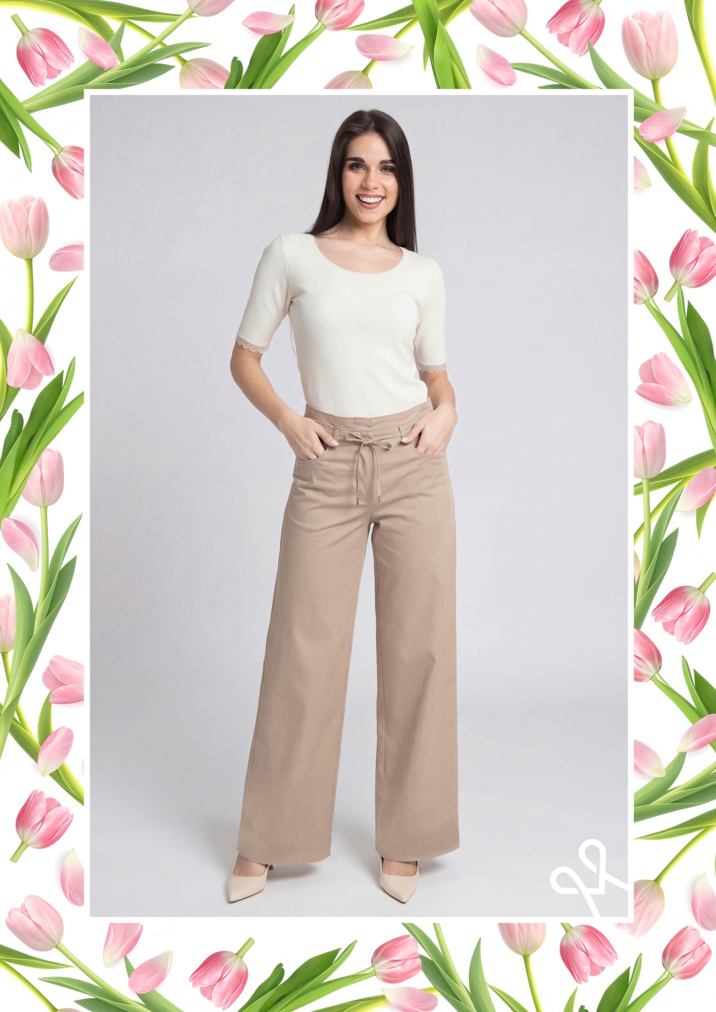 Bézs színű, vászon Magenta nadrág, bővebb szárú, elején gombos és pattentos záródással, derékrészen megkötővel, zsebekkel. Hátul rávarrt Magenta márkajelzés.