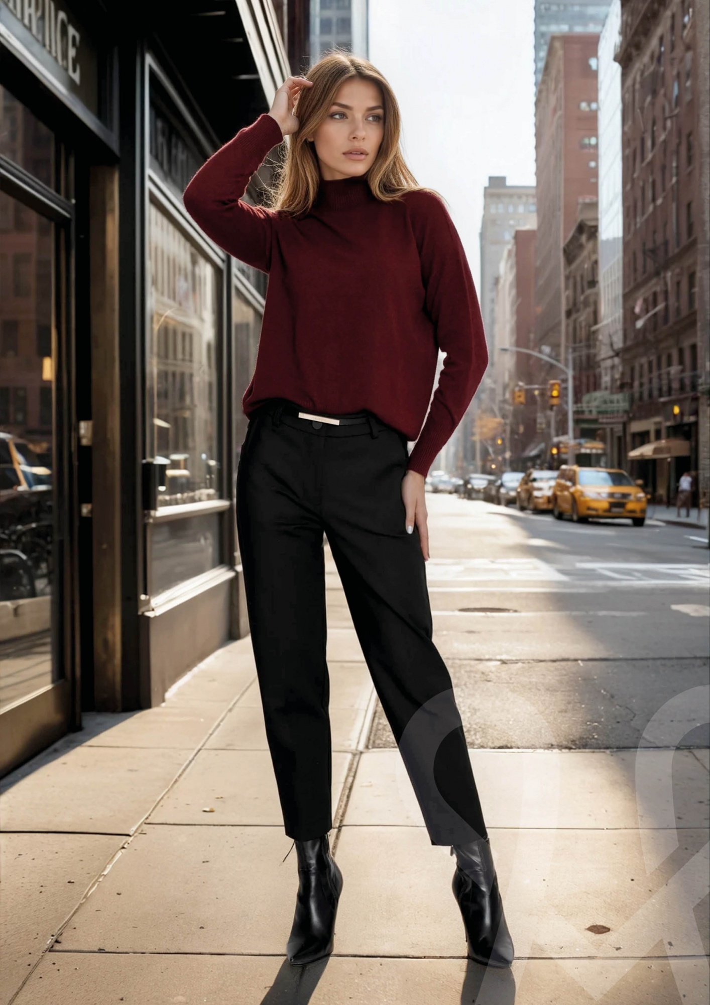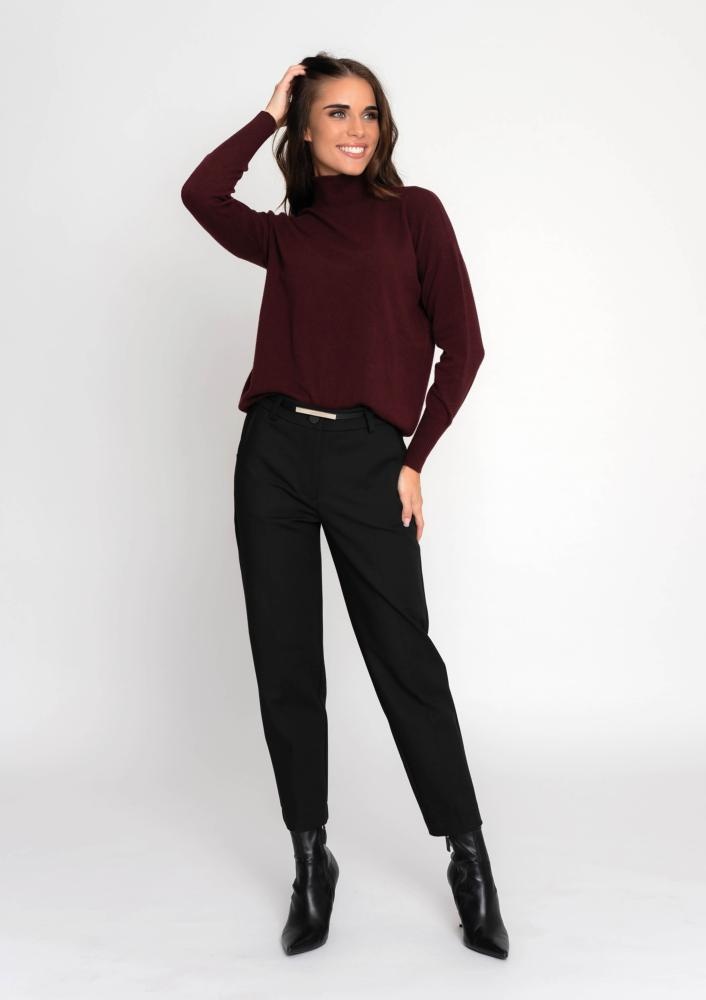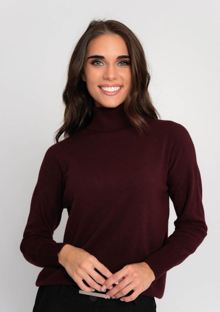 Finom, vékony kötésű, bordó színű, elasztikus pulóver garbós nyakkal és hosszú ujjal, amely elegáns, nőies megjelenést és kényelmes viseletet biztosít.