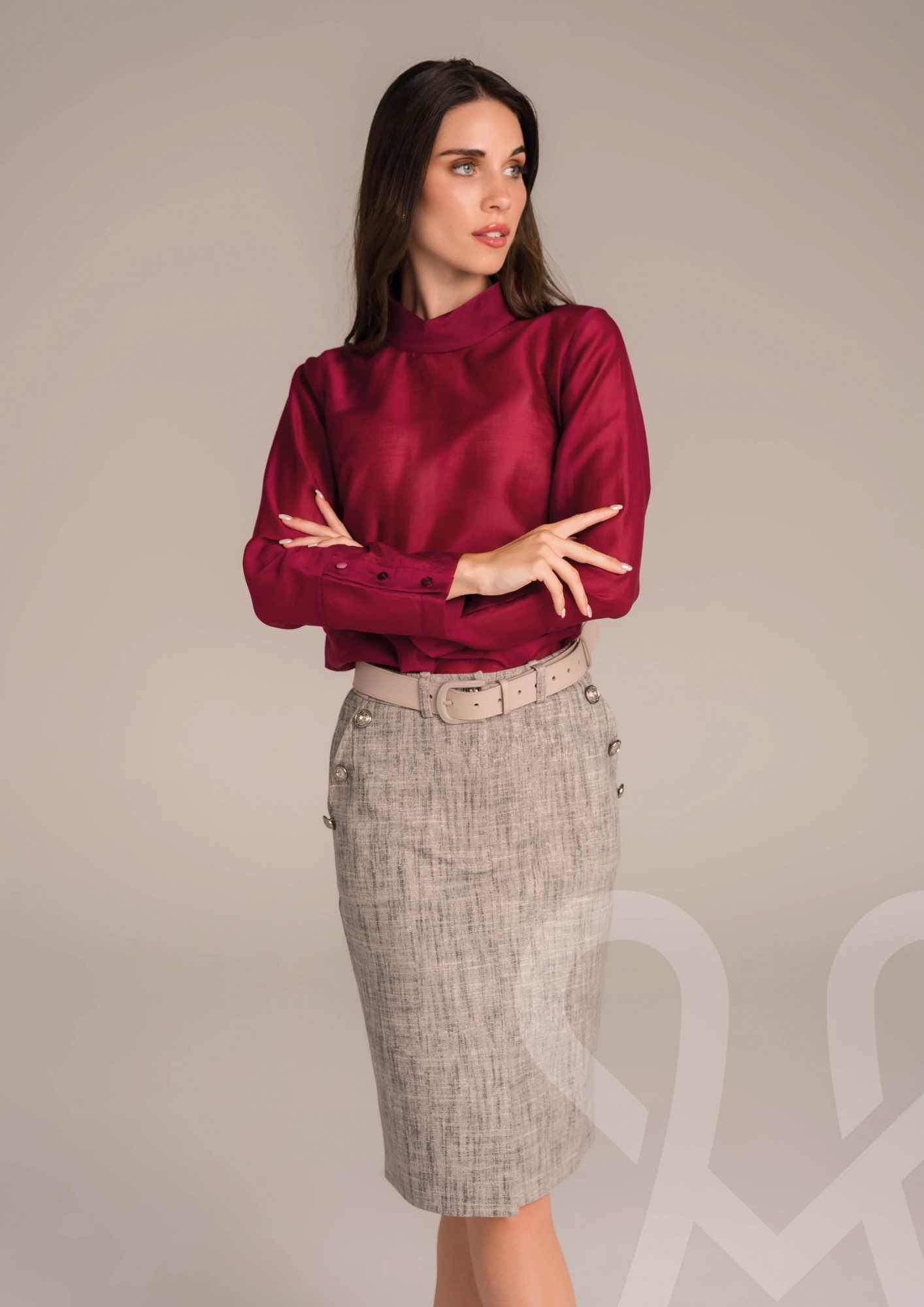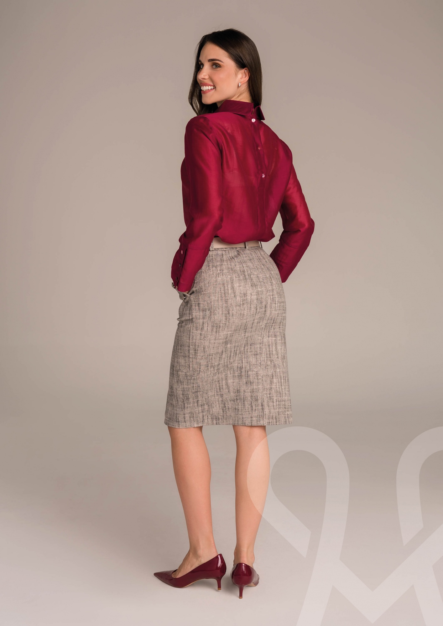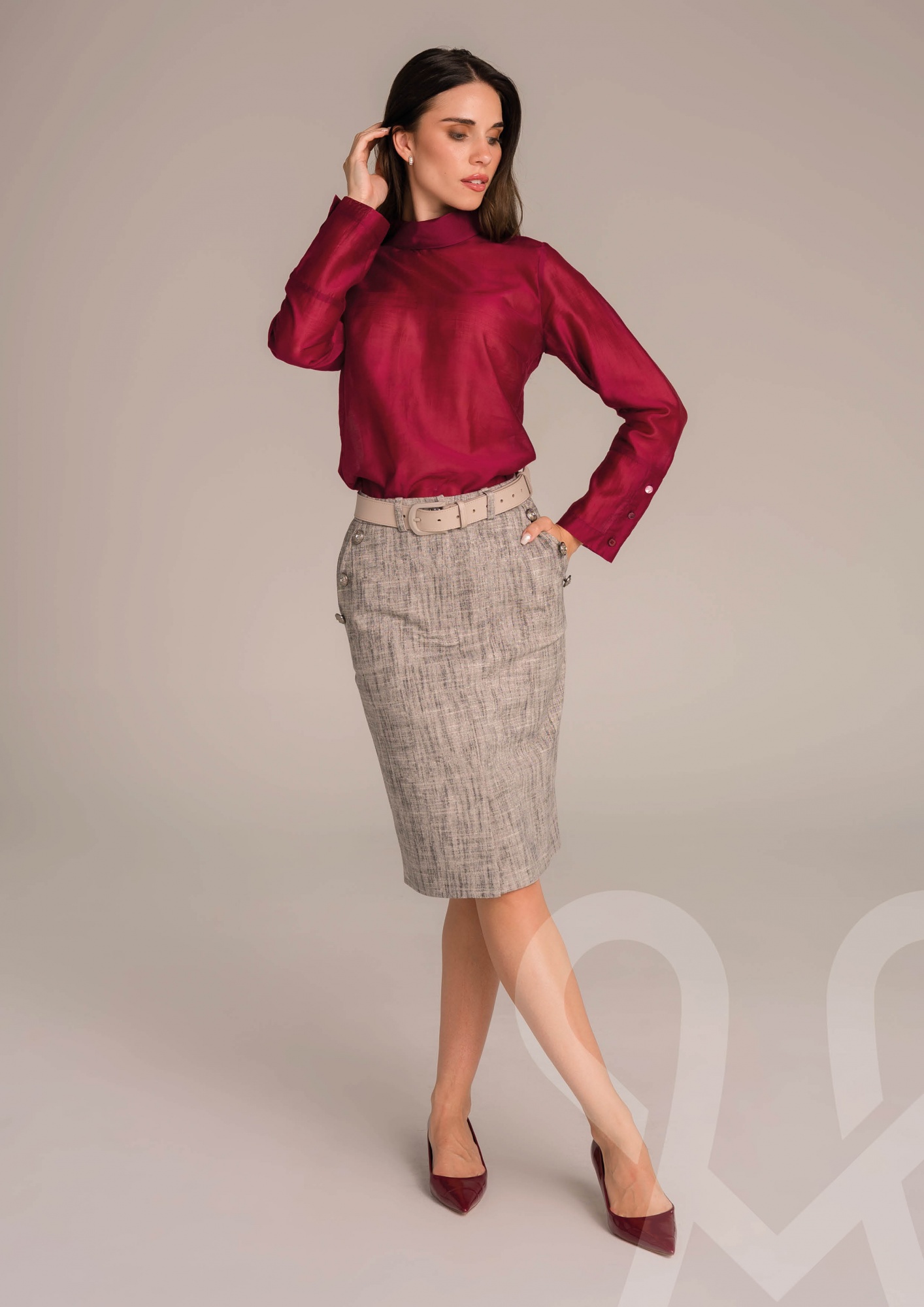 Ez a bővebb fazonú, bordó színű muszlin felső a könnyed elegancia megtestesítője. Légies, lágy esésű anyaga kényelmes viseletet biztosít, miközben a klasszikus gallér és a hátul gombolható záródás diszkrét, nőies részletekkel teszi különlegessé. A széles mandzsetták finom kontrasztot teremtenek a lezserebb szabással, kiemelve a csuklót és elegáns keretet adva az egész megjelenésnek. Tökéletes választás munkába, alkalmi eseményre vagy akár egy stílusos hétköznapra – egy szűk nadrággal vagy szoknyával kombinálva igazán kifinomult outfitet alkot.