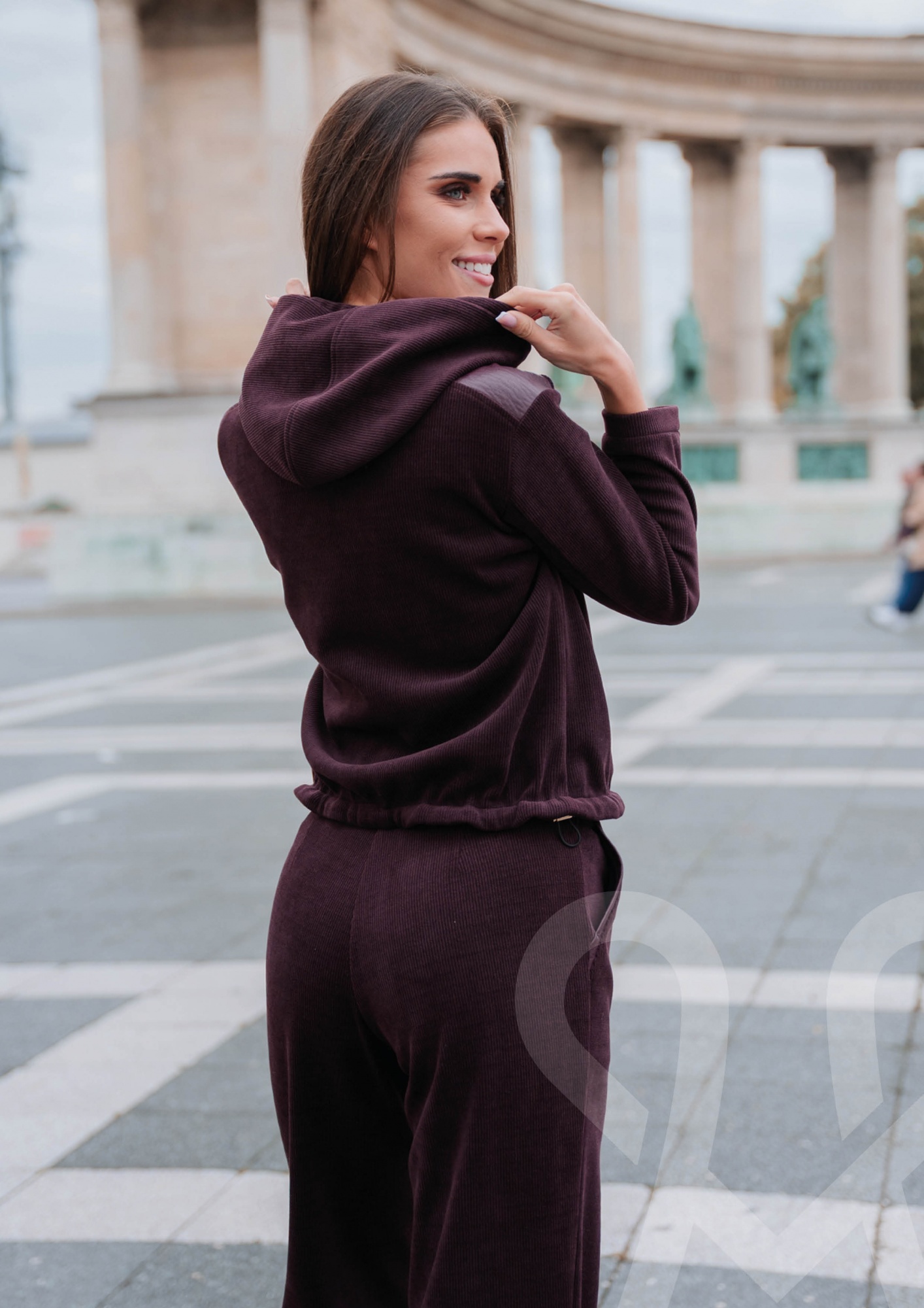 Kényelmes, lazább sportos fazonú bordó melegítőfelső cipzáras elrészmegoldással, oldalzsebekkel és praktikus kapucnival a lezser mindennapokra.
