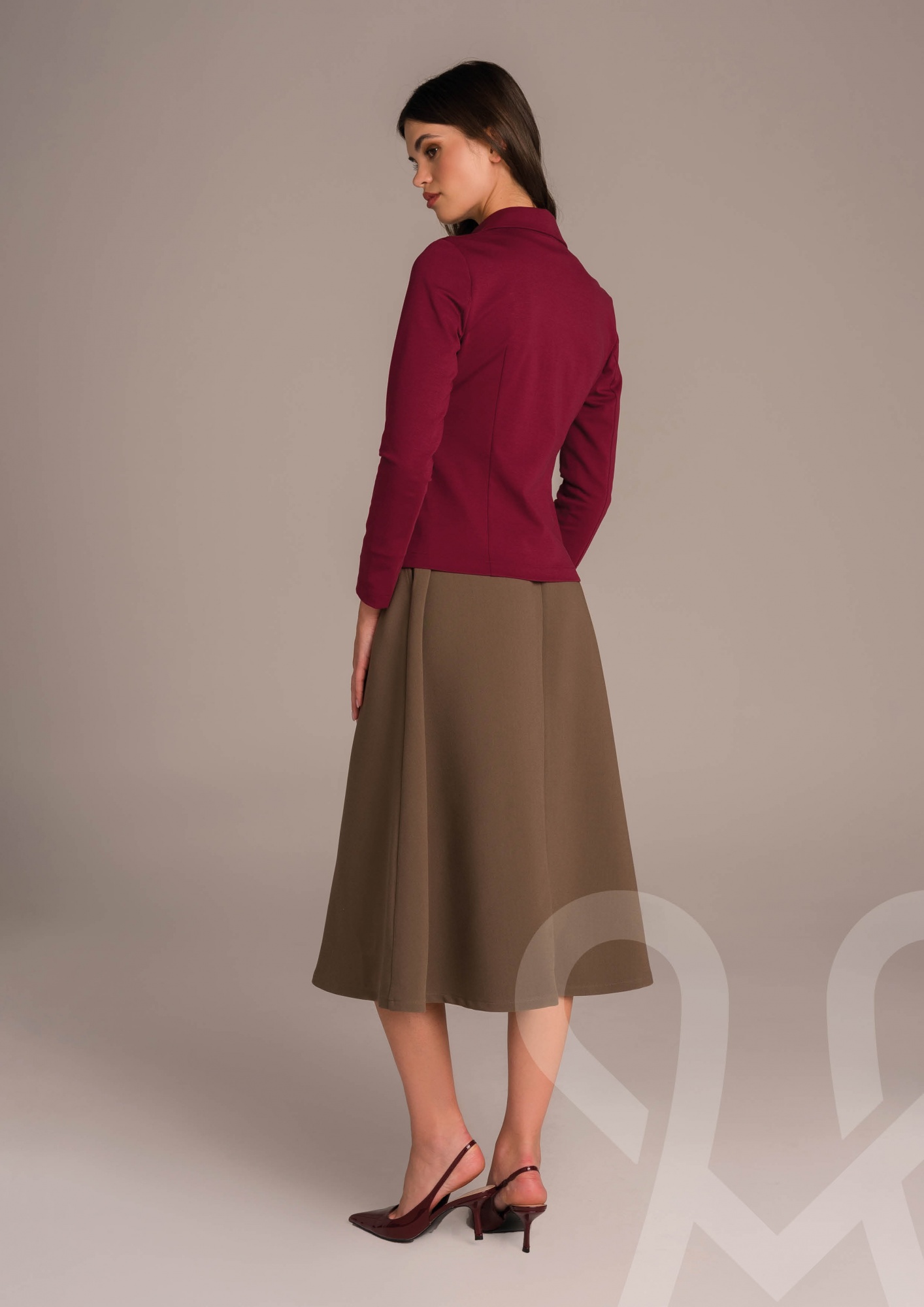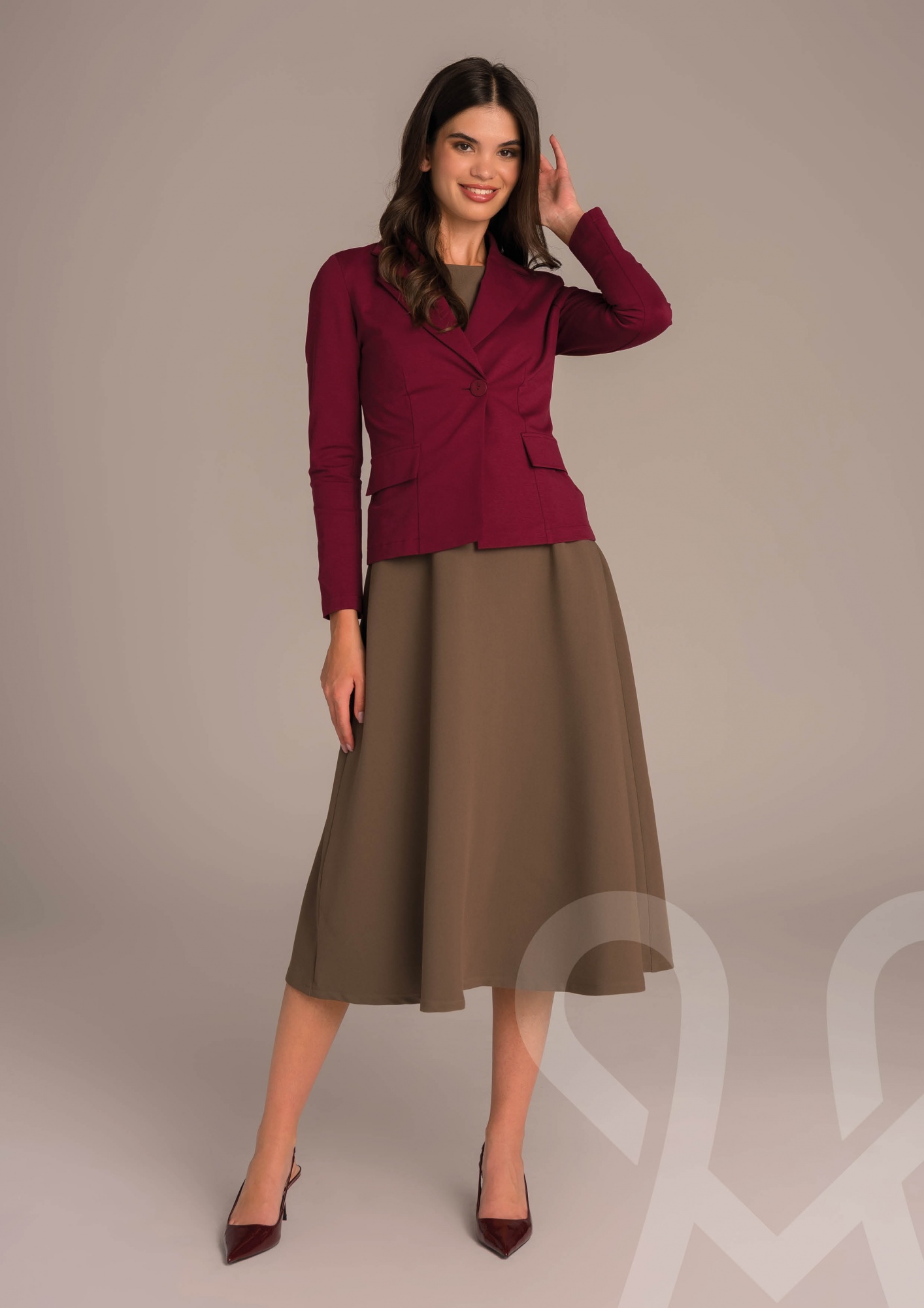 Ez az alakot követő, bordó színű punto zakó elegáns és nőies megjelenést biztosít, miközben a rugalmas, elasztikus anyag maximális kényelmet nyújt egész nap. A zakó klasszikus gombos záródással és kihajtós gallérral rendelkezik, zsebfedőkkel díszítve, melyek tovább emelik a darab kifinomultságát. Tökéletes választás irodai viselethez, alkalmi megjelenéshez vagy akár egy elegáns hétköznapi outfit részeként. A mély bordó árnyalat könnyen kombinálható semleges és élénk színekkel is, így ez a zakó a gardróbod sokoldalú alapdarabja lesz.