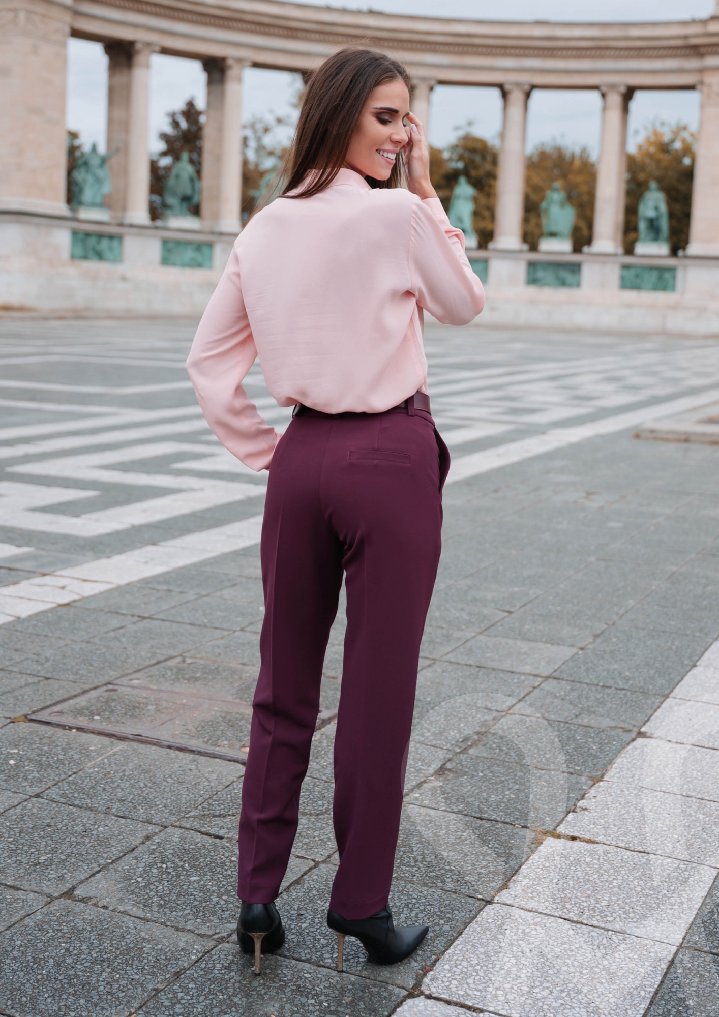 Elegáns, egyenes fazonú burgundi nadrág kevert szálas anyagból, él vasalt részletekkel és oldalzsebes cipzáras záródással a kifinomult, modern megjelenésért.