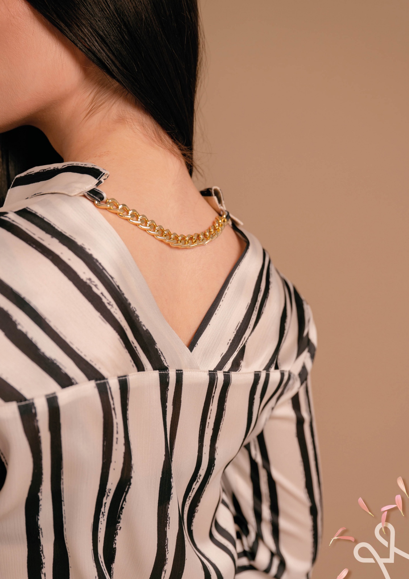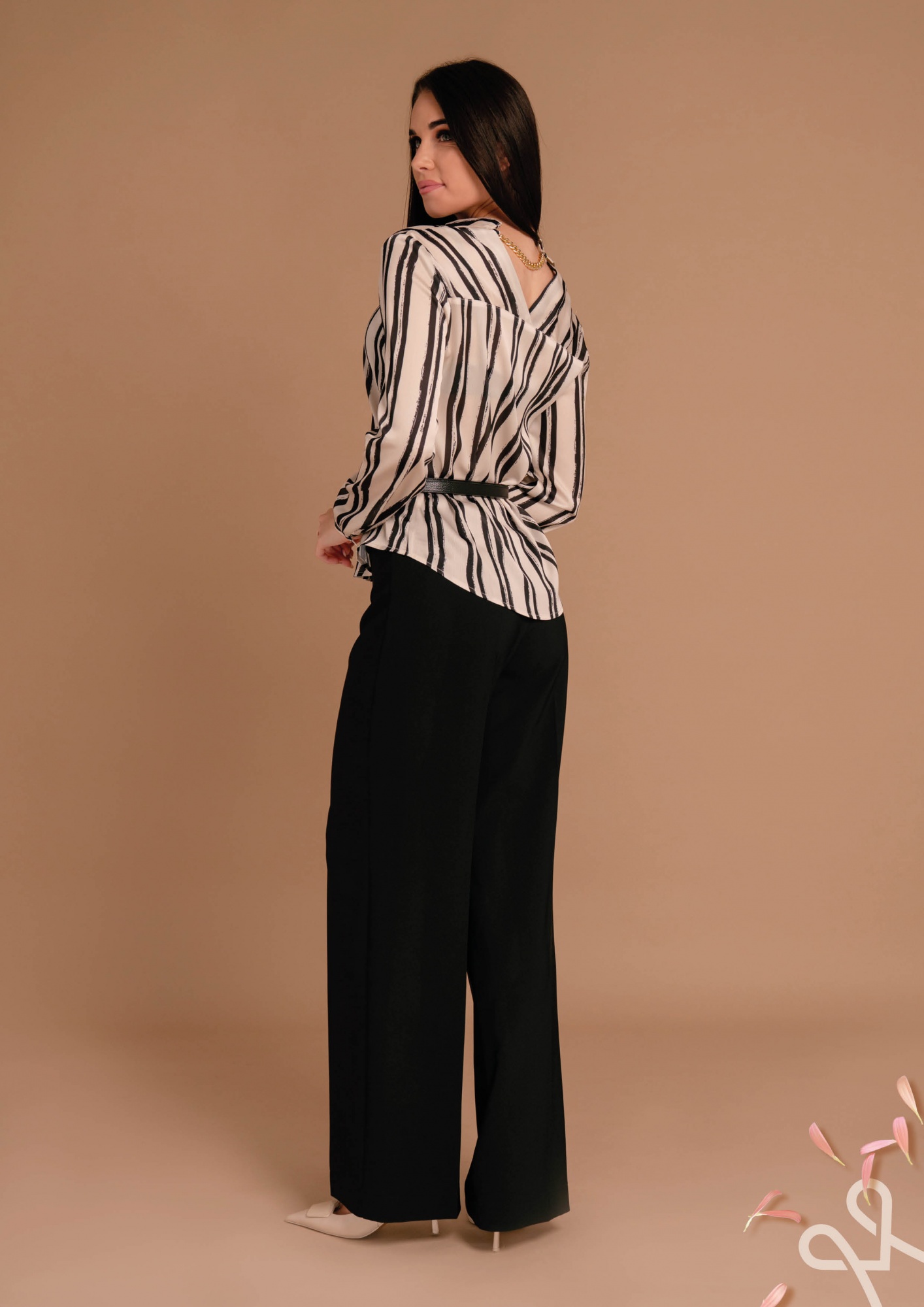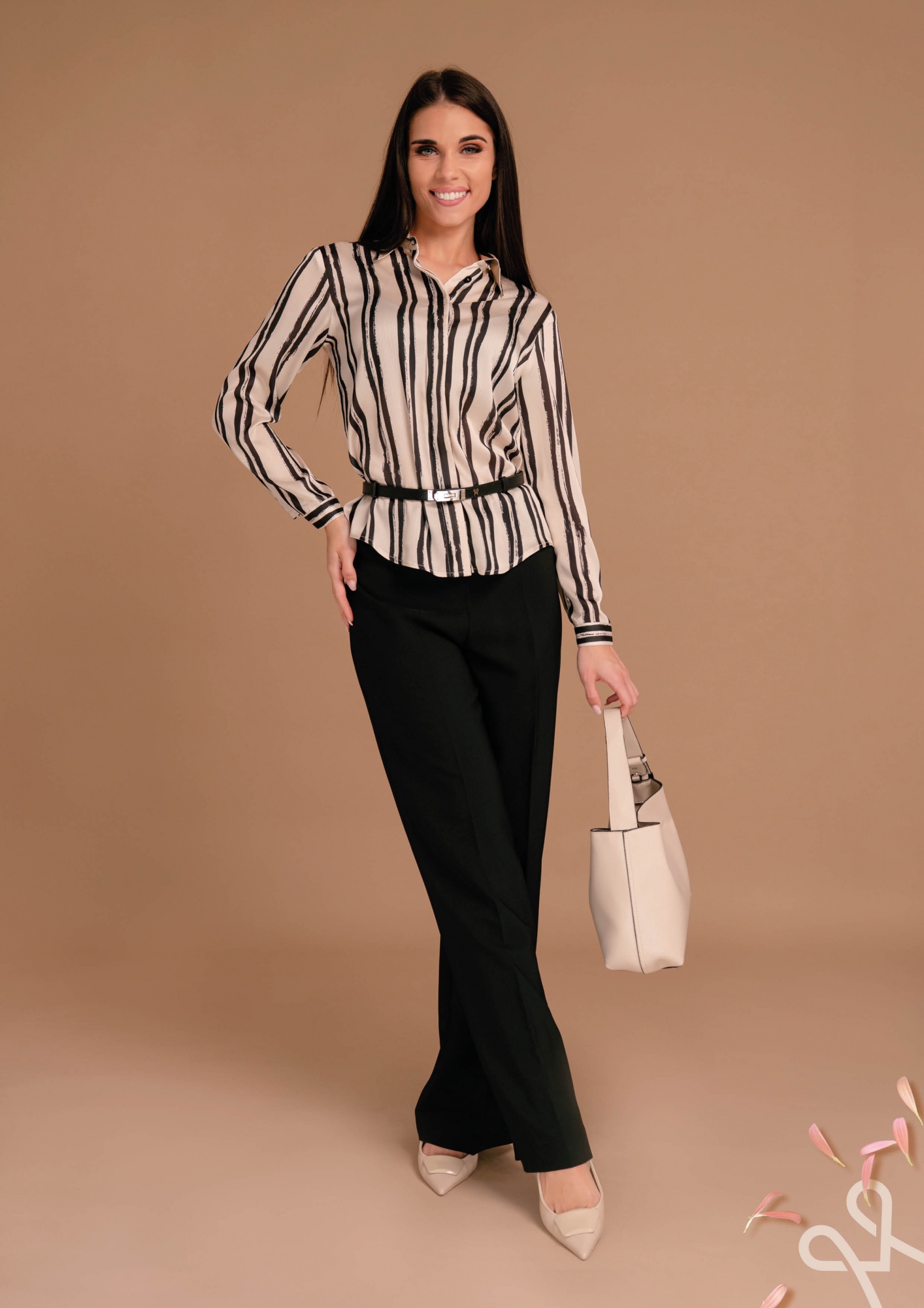 Csíkos mintájú, lazább fazonú női ing kevert szálas anyagból, elején gombos záródással, gallérral és gombolható mandzsettával, amely elegáns és stílusos tavaszi viselet.