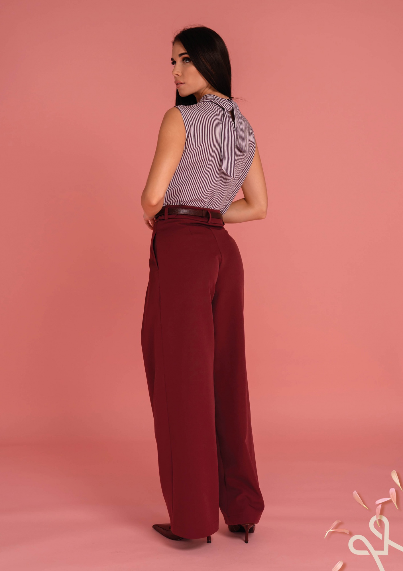 Bordó csíkos, ujjatlan, laza szabású női ing hátán megkötős és elején hajtással, amely könnyed és stílusos tavaszi viseletet biztosít.