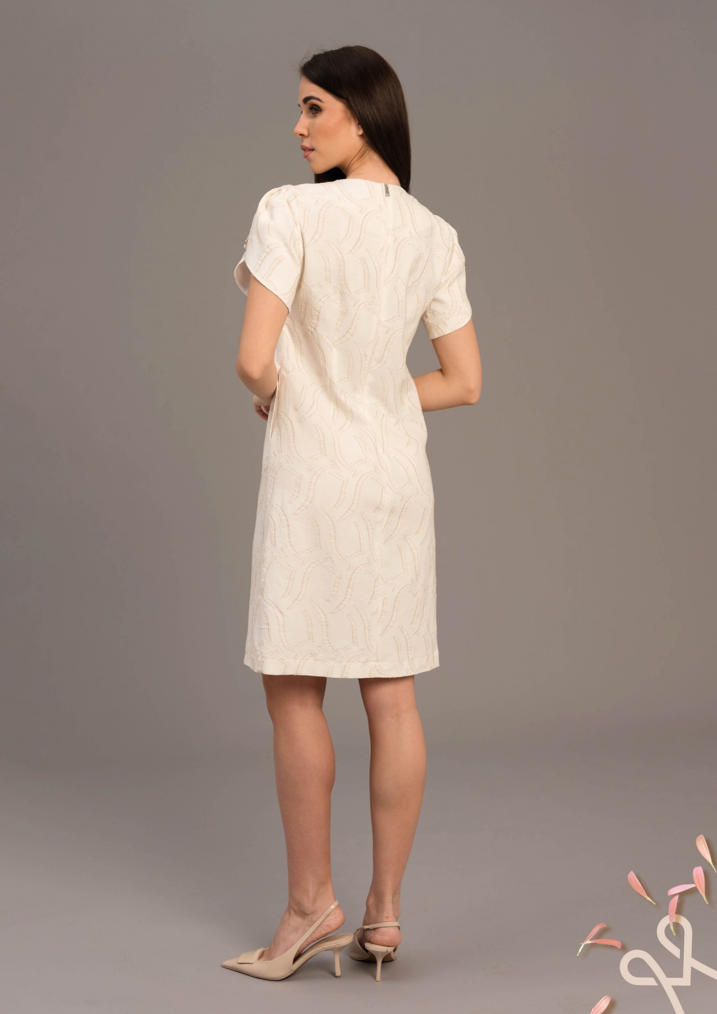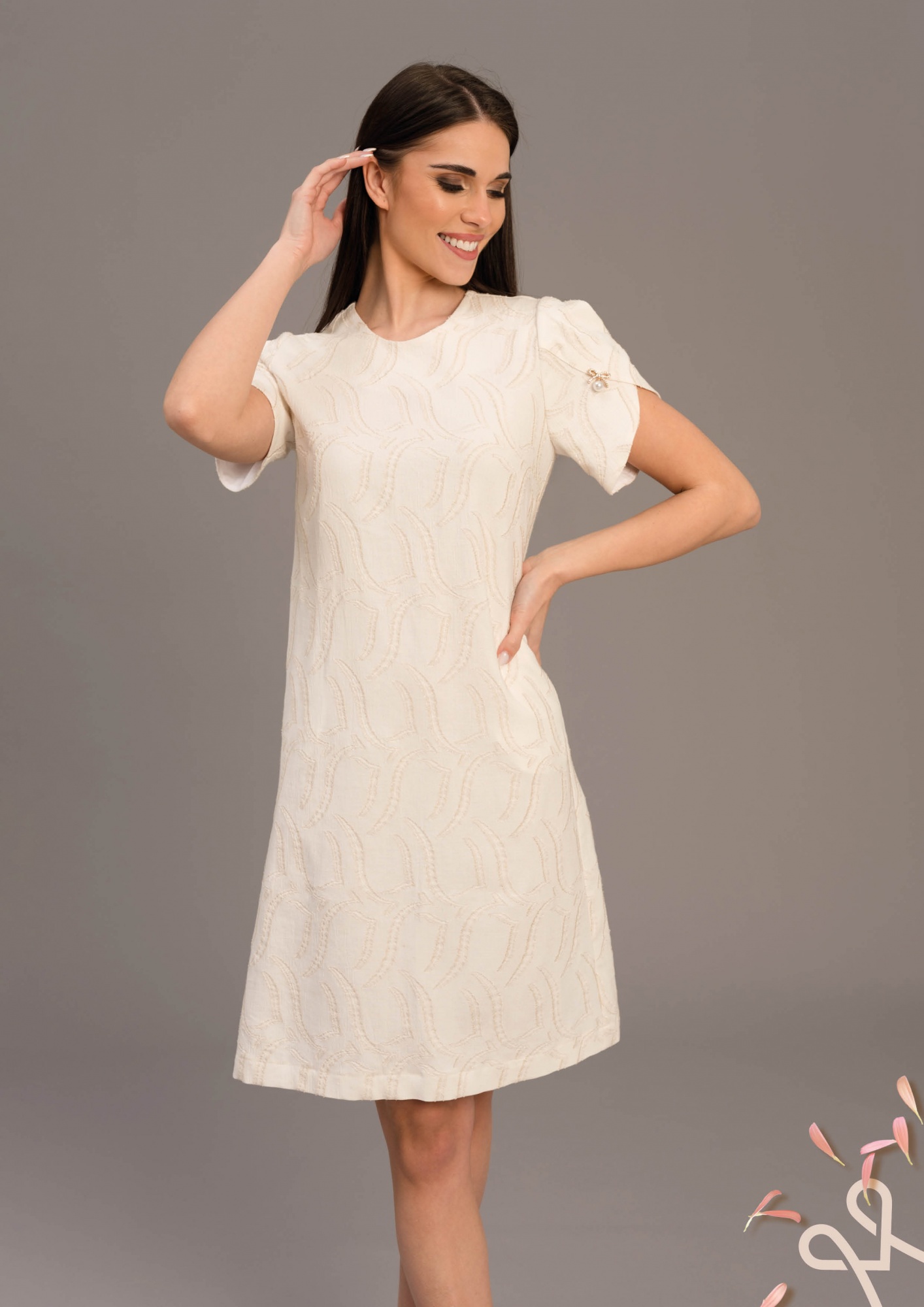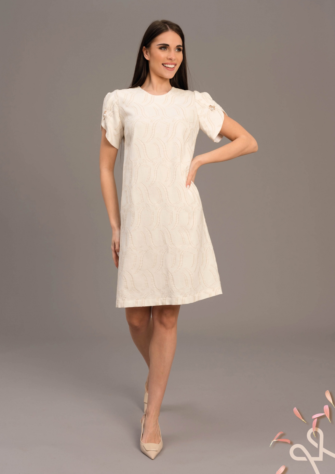 Egyenes fazonú pamutvászon ruha kerek nyakkivágással, rövid tulipán ujjal, hátul cipzáras záródással és elegáns csipkés vajszínű anyagból.