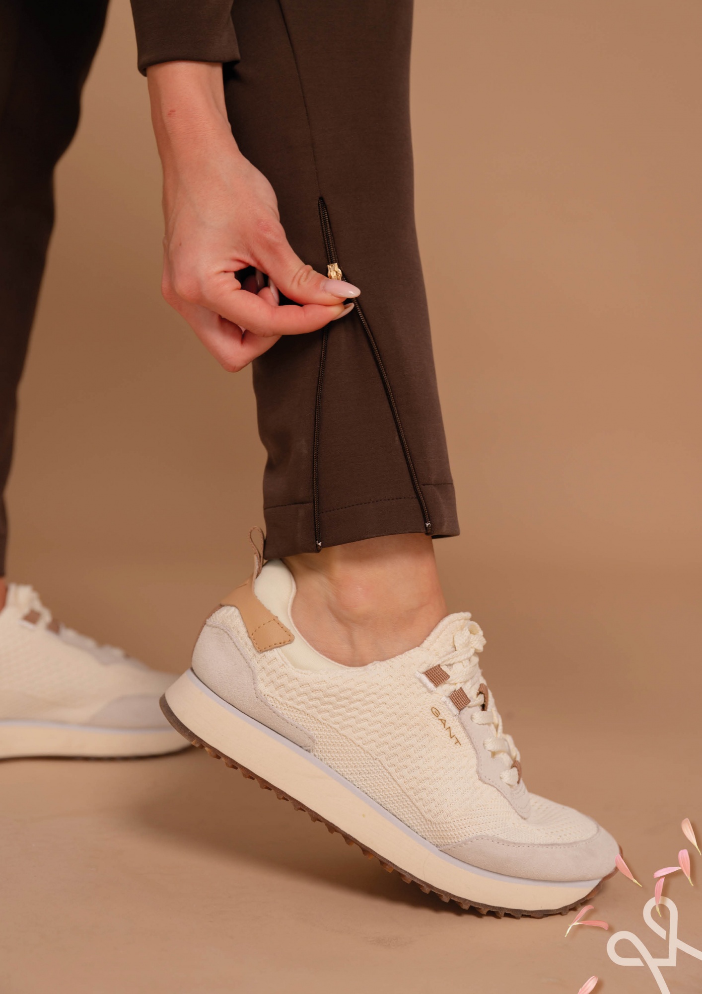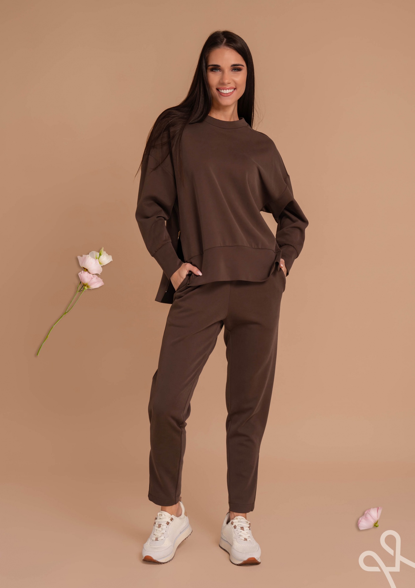 Csokibarna színű, szűkülő szárú nadrág elasztikus, gumis derékkal és praktikus oldalzsebekkel, amely kényelmes viseletet és letisztult eleganciát kínál.