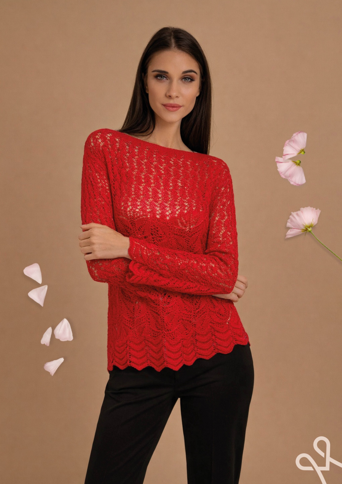 Piros színű, alakot követő, szűkebb fazonú női kötött pulóver elasztikus anyagból, csónak nyakkivágással és hosszú ujjal, amely elegáns és stílusos tavaszi megjelenést biztosít.
