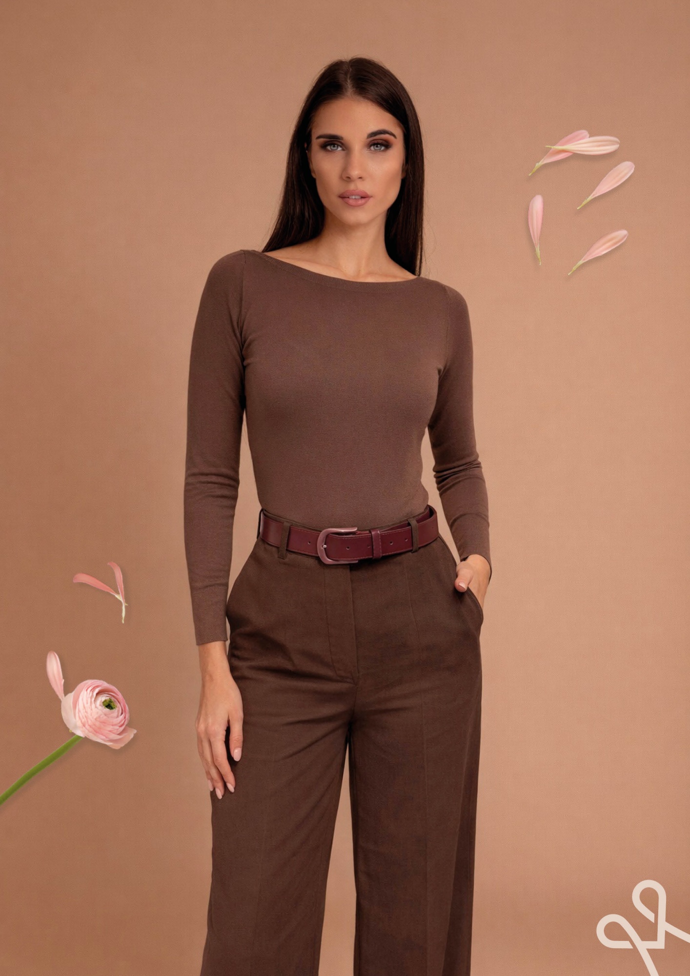 Elasztikus kötött anyagból készült, szűk szabásvonalú, csokibarna színű Magenta felső.