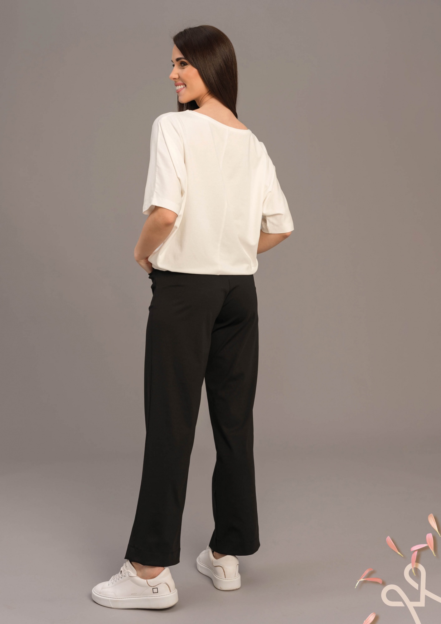 Egyenes fazonú, fekete elasztikus puntó nadrág cipzáras és kapcsos elejű záródással, oldalzsebekkel a letisztult, elegáns megjelenésért.