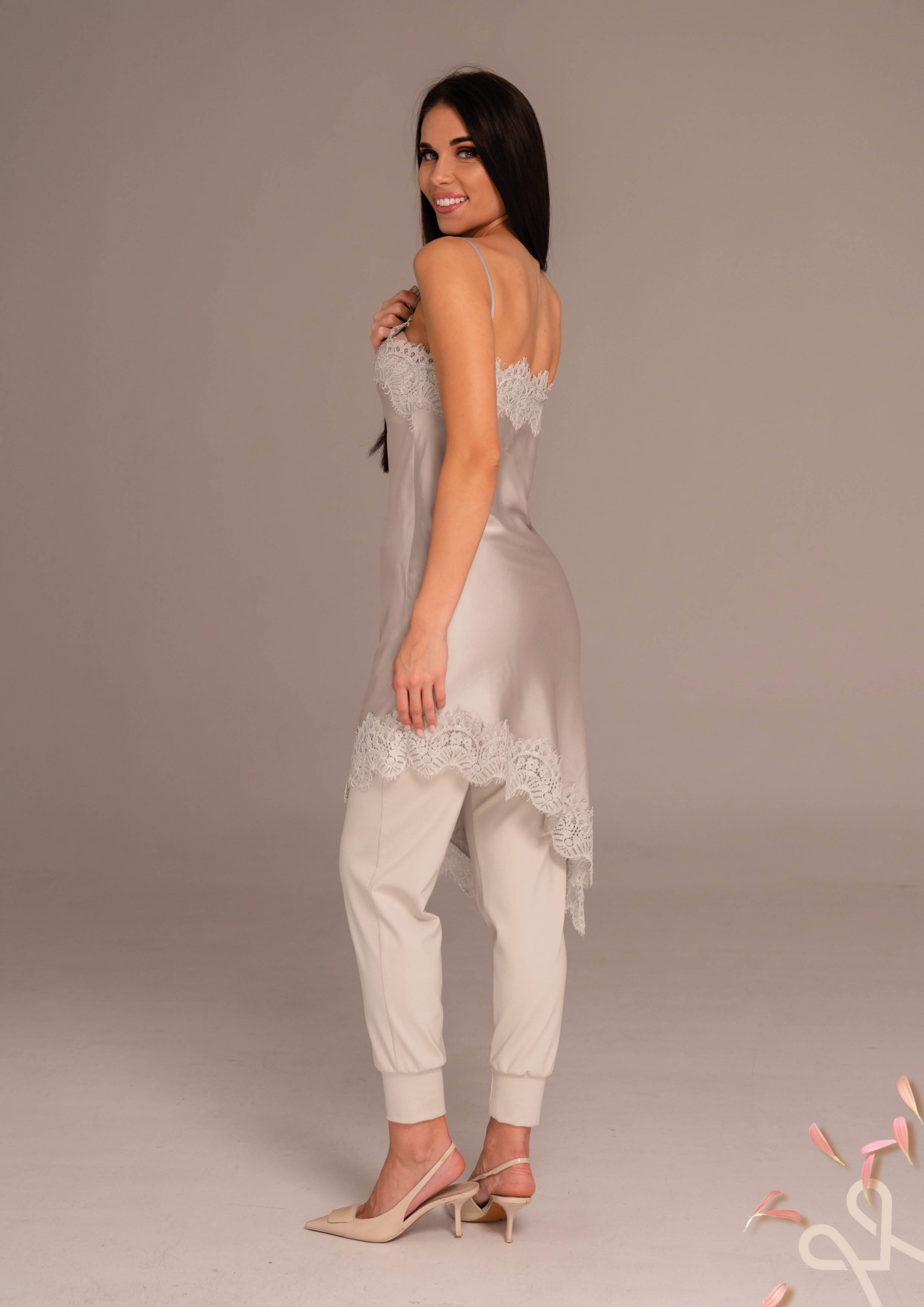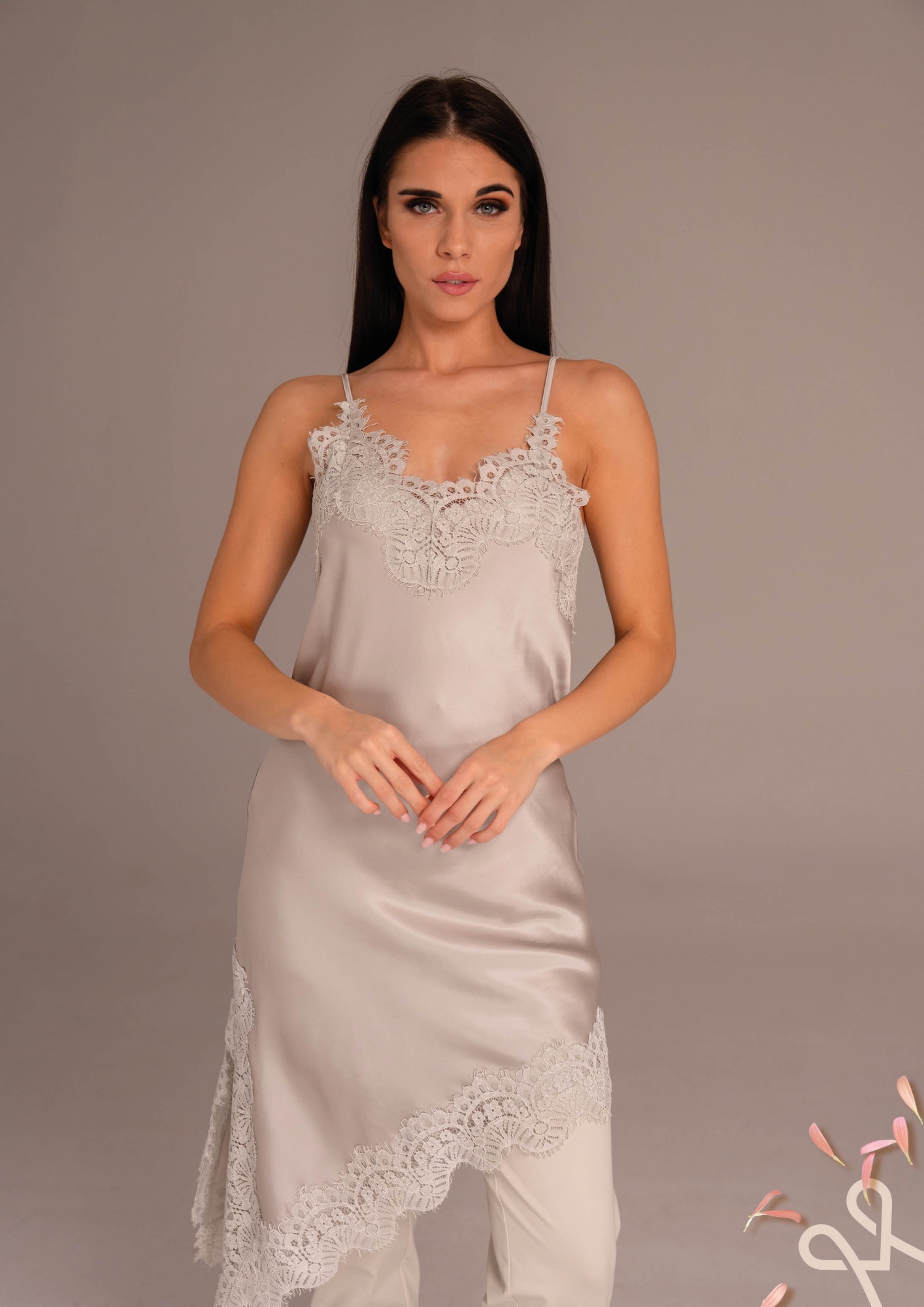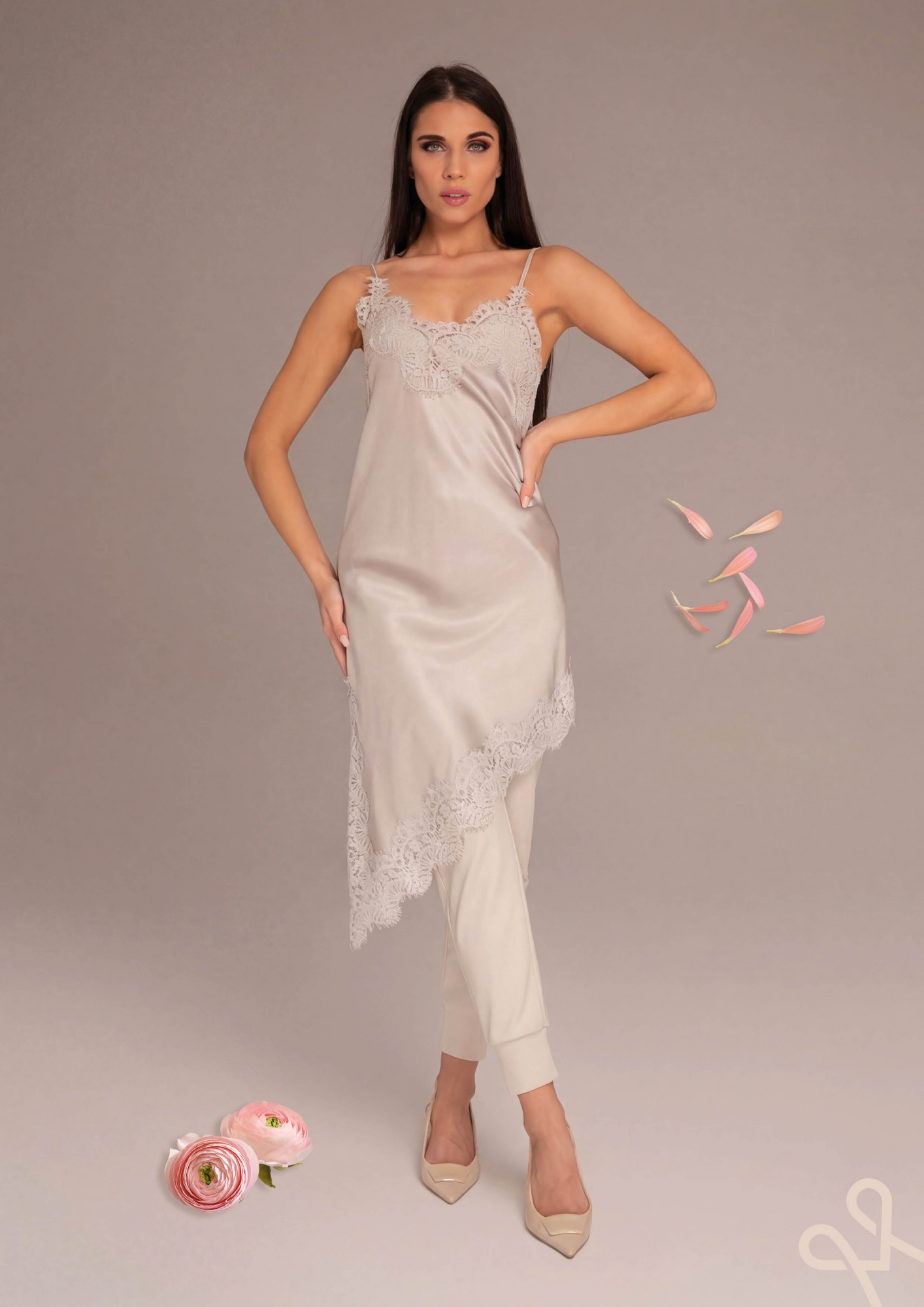 Ezüst színű, alakot követő női szatén-csipke ruha spagetti pántokkal és asszimetrikus aljrészlettel, amely elegáns és kifinomult tavaszi-estélyi megjelenést biztosít.