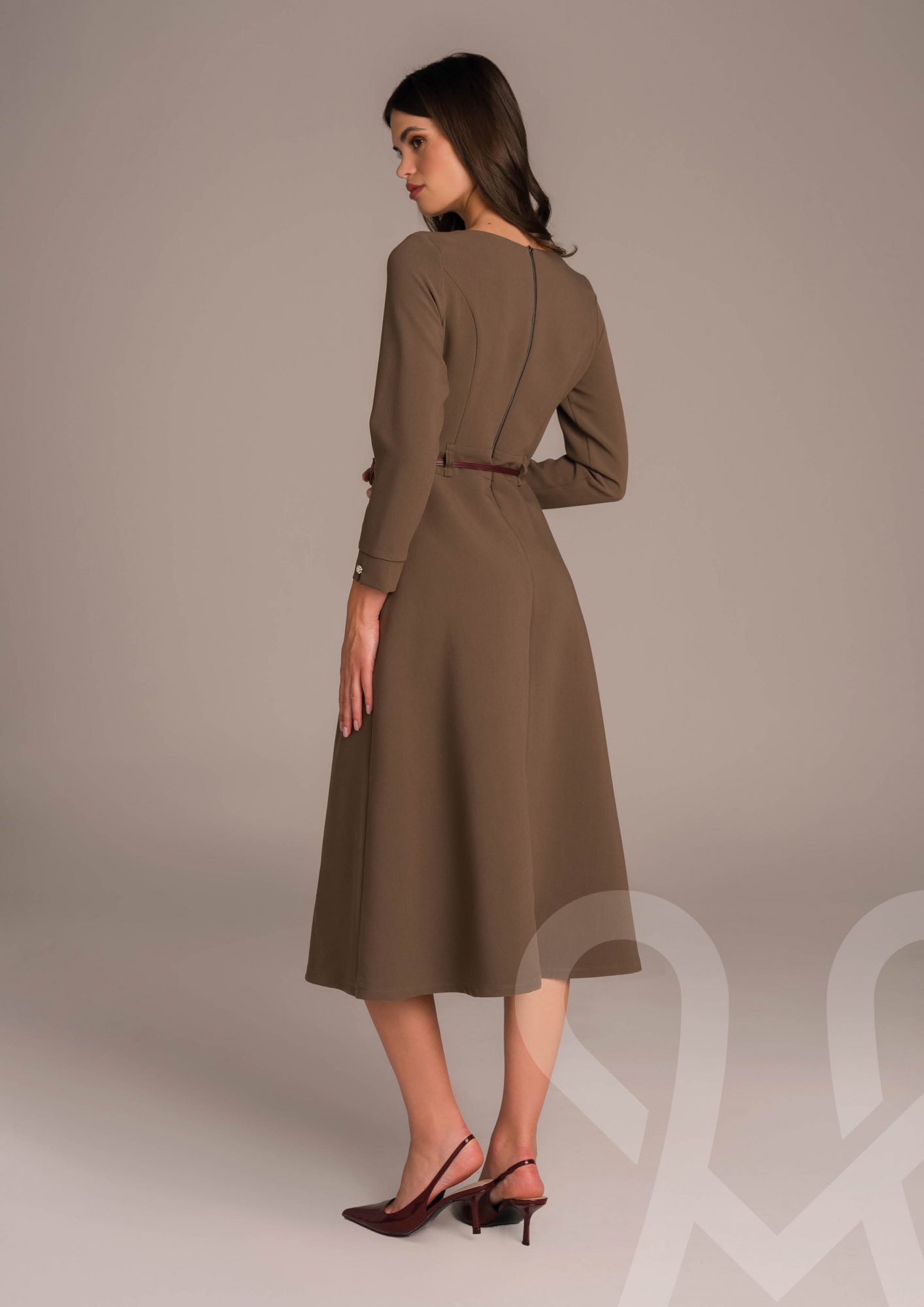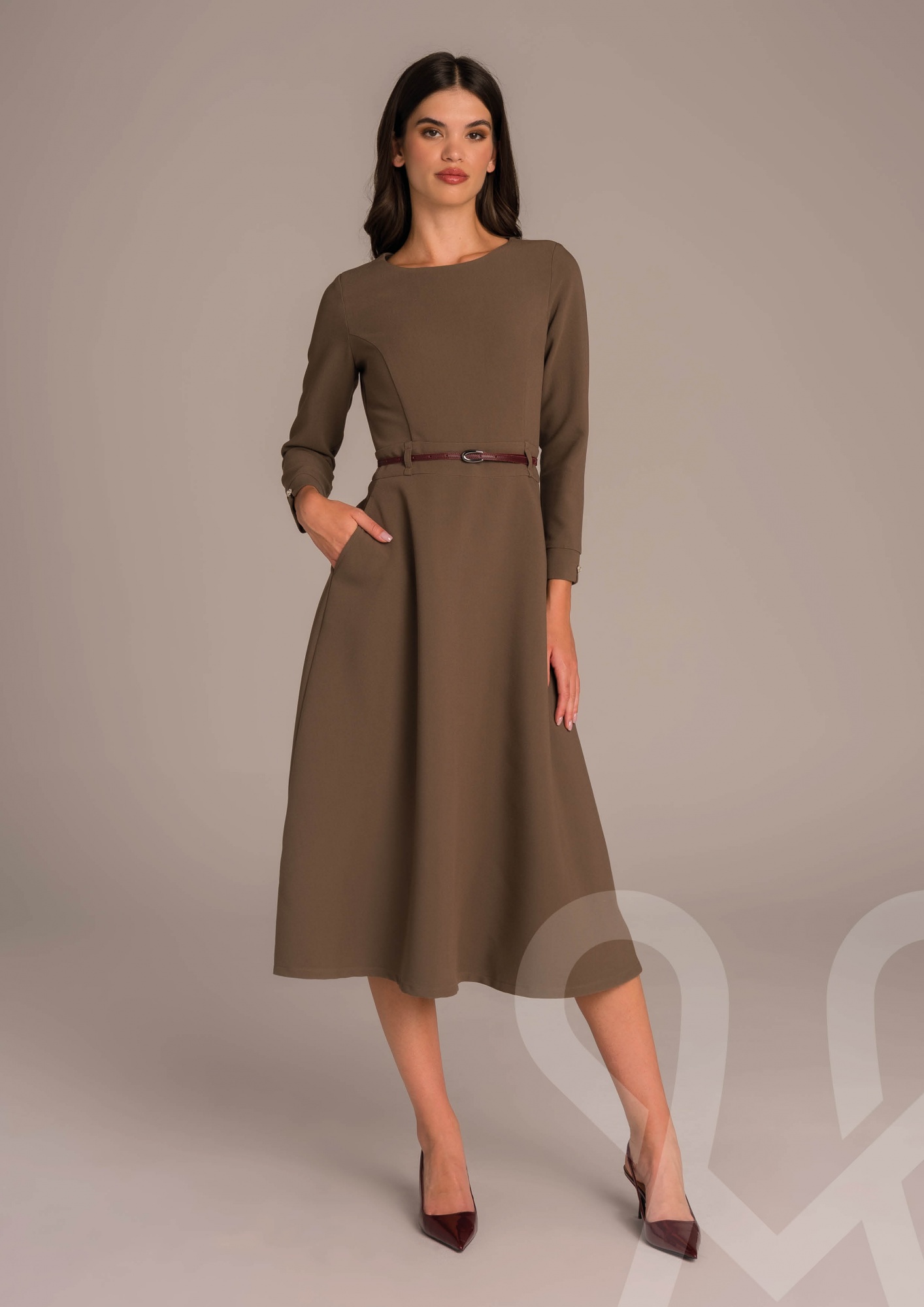 Ez a csinos fazonú, fango színű ruha elegáns és kifinomult megjelenést biztosít bármilyen alkalomra. A test vonalát követő szabás kiemeli az alakot, míg a térd alá érő hossz és a széles övrész bújtatókkal hangsúlyozza a nőies sziluettet. A szürkésbarna, semleges árnyalat tökéletes alapdarab, amely könnyen kombinálható élénk vagy földszínekkel. Legyen szó irodai viseletről, alkalmi eseményről vagy egy stílusos hétköznapról, ez a ruha garantáltan elegáns megjelenést biztosít.