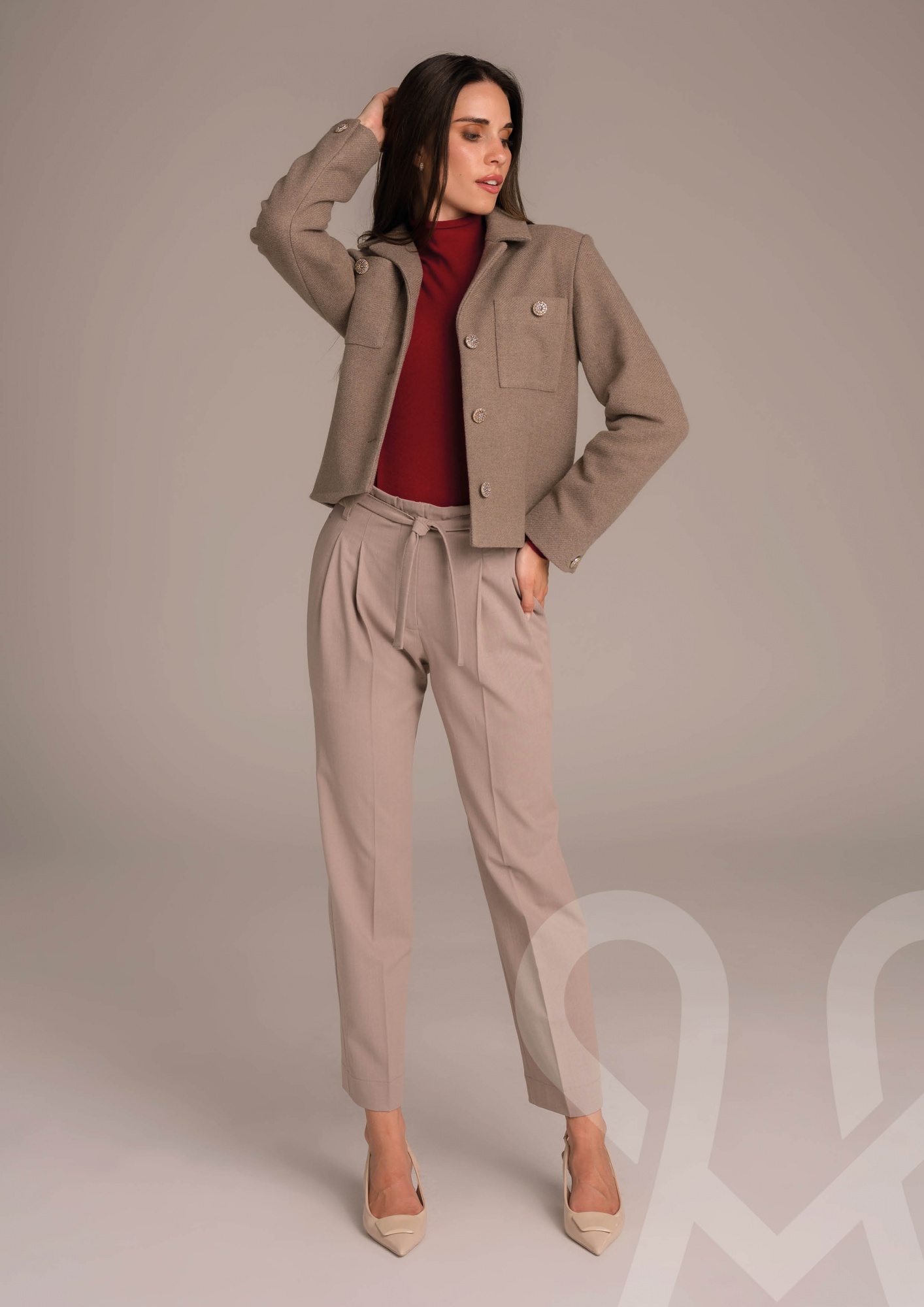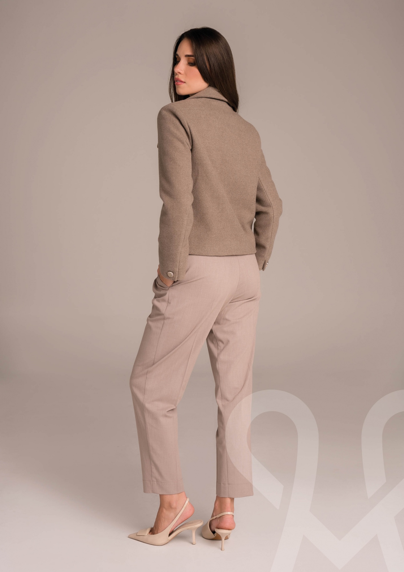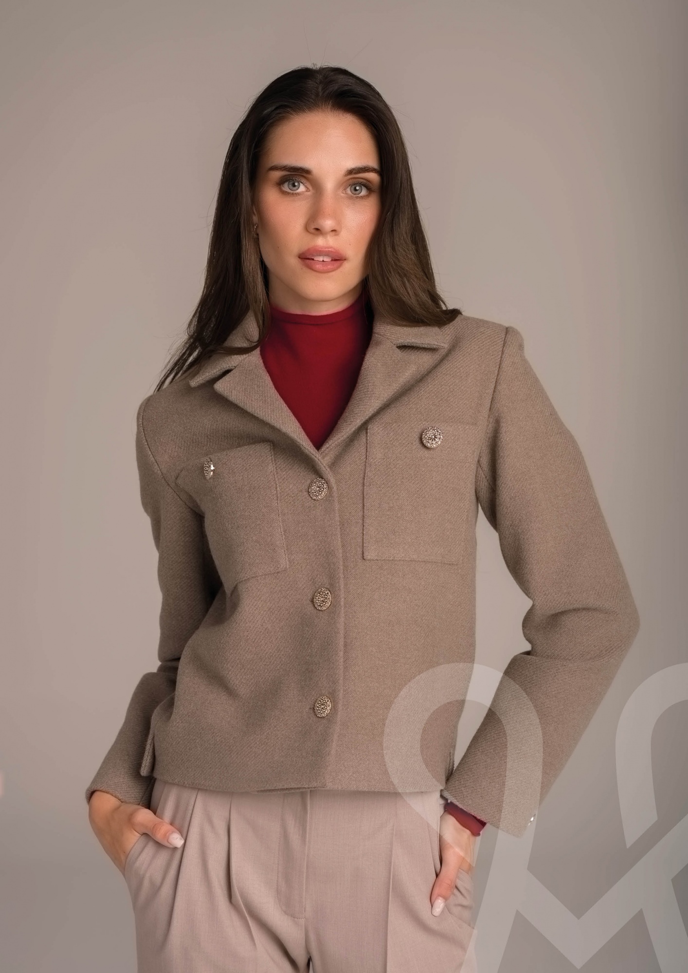 Lazább szabású, fango színű Magenta szövet kiskabát fazonos lehajtós gallérral, elején gombos záródással, foltzsebekkel és gombos díszítéssel.