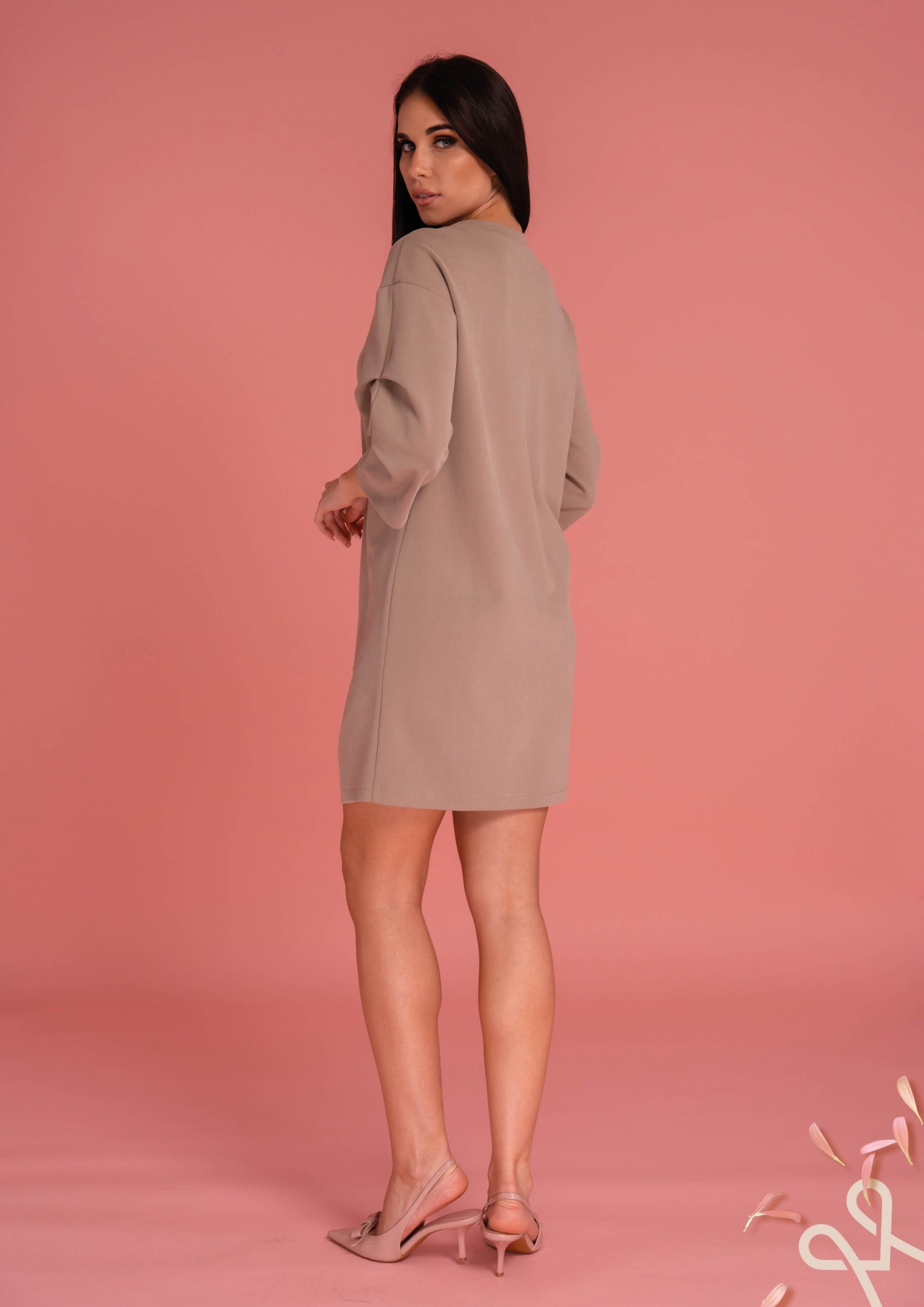 Fango színű, laza fazonú női ruha, elején és ujjain finom hajtásokkal, valamint apró arany dísszel díszítve, amely elegáns és stílusos tavaszi megjelenést biztosít.