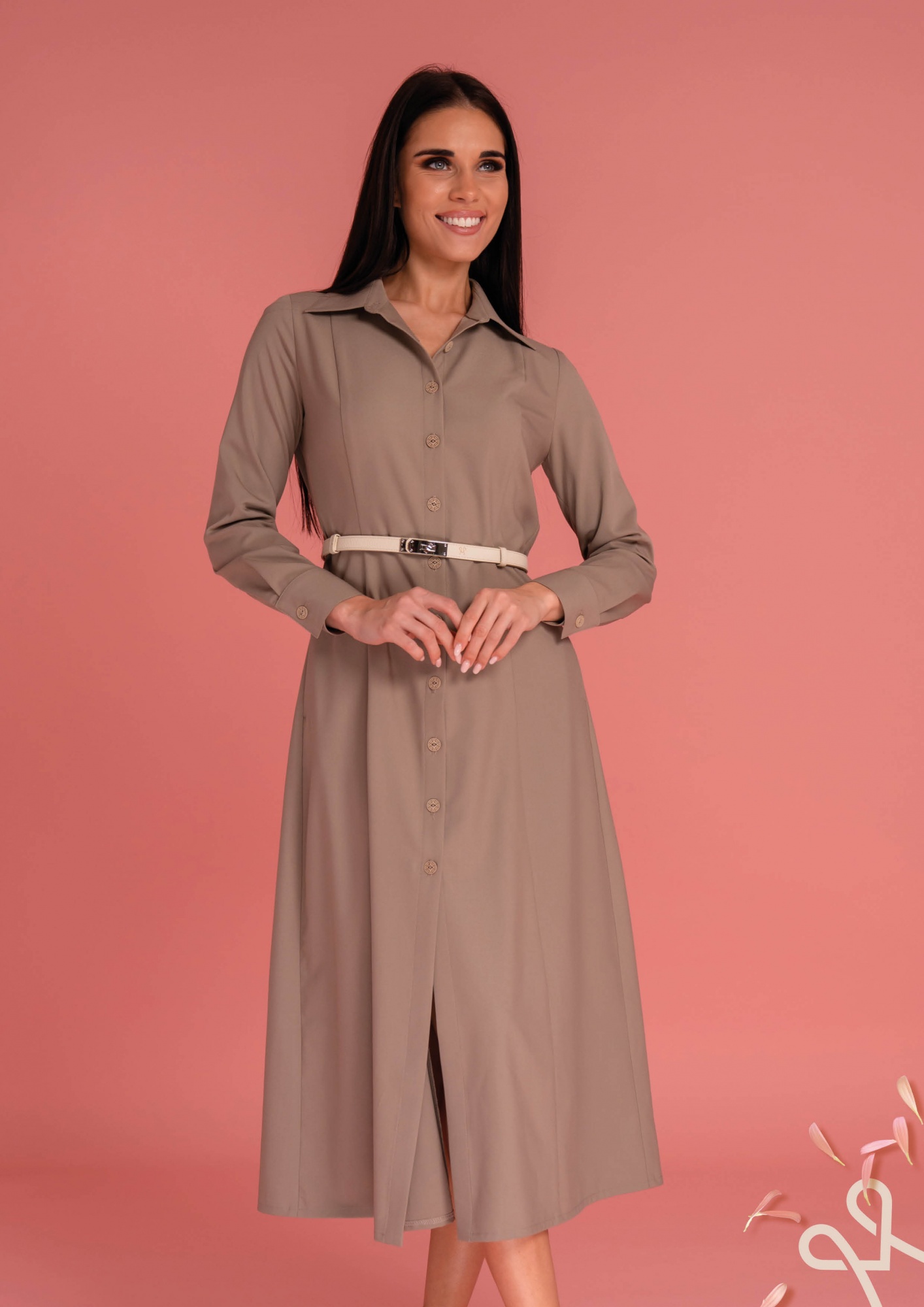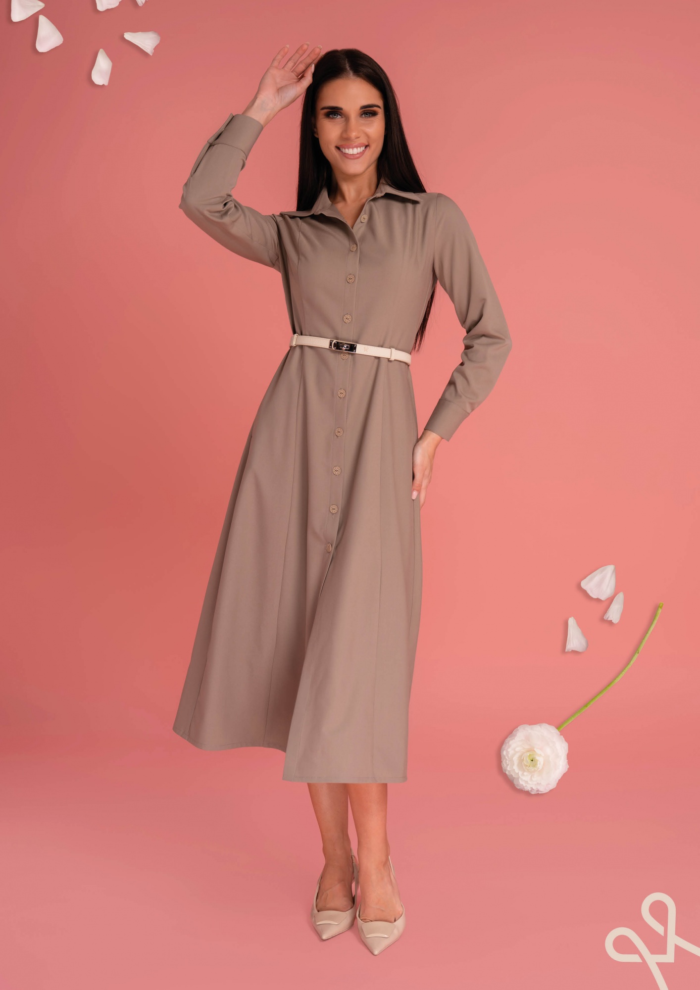 Fango színű, lefelé bővülő, gombos elasztikus női ruha ing gallérral, mandzsettával és derékban övvel, amely elegáns és stílusos tavaszi megjelenést biztosít.