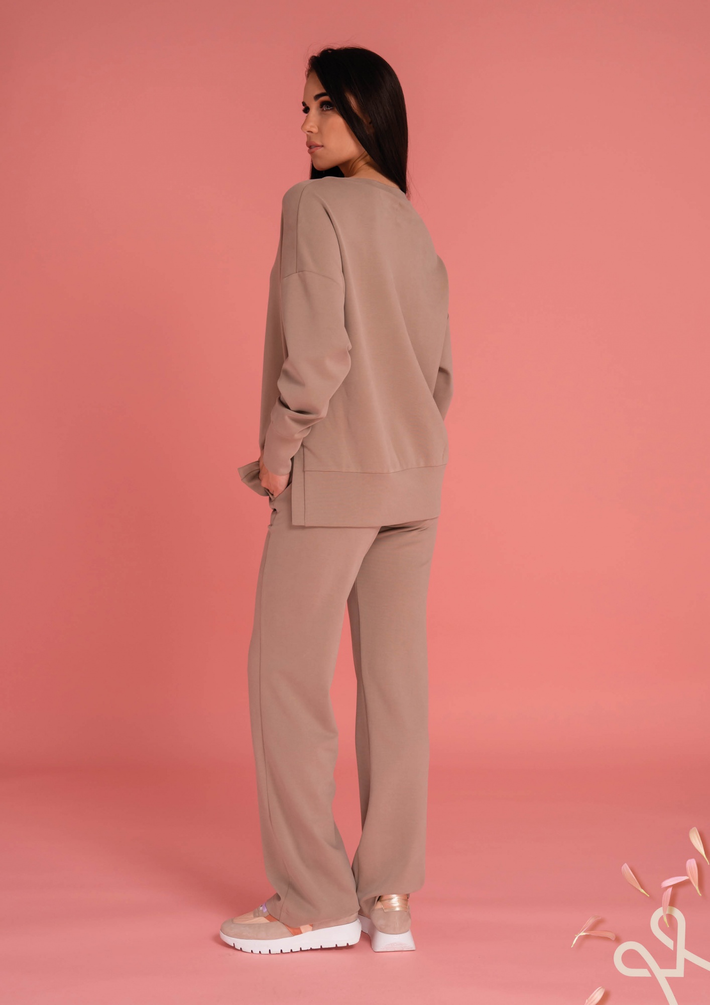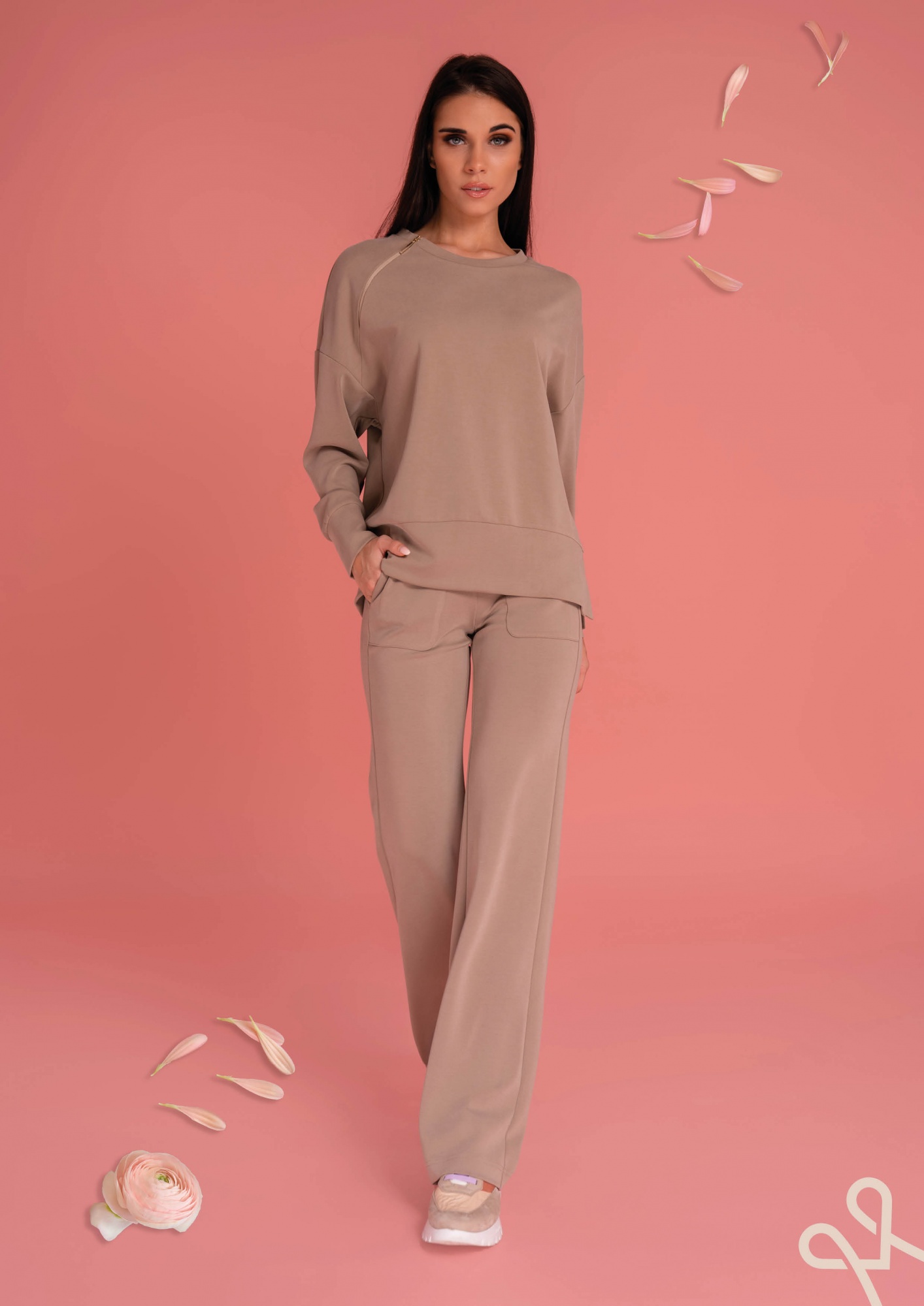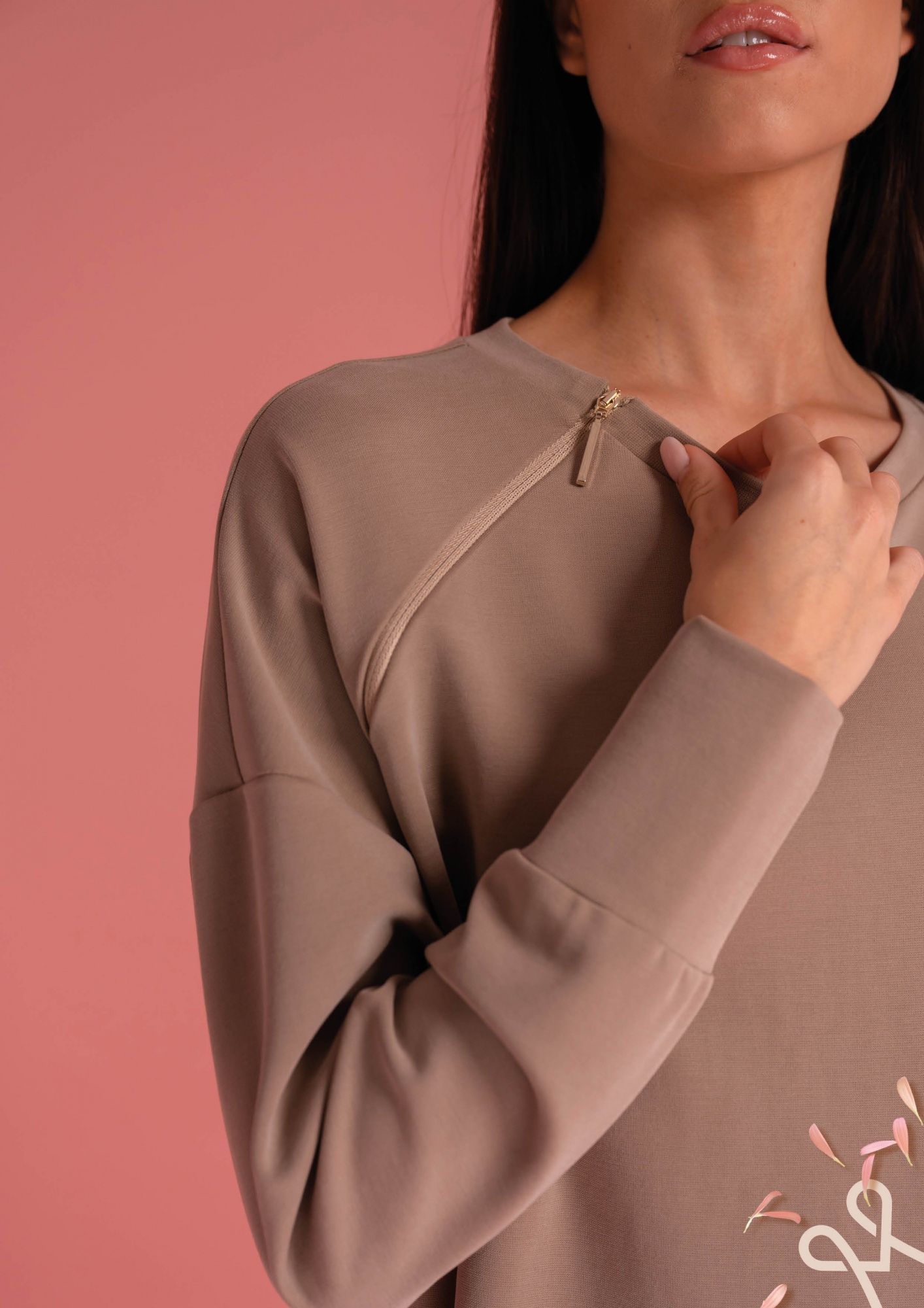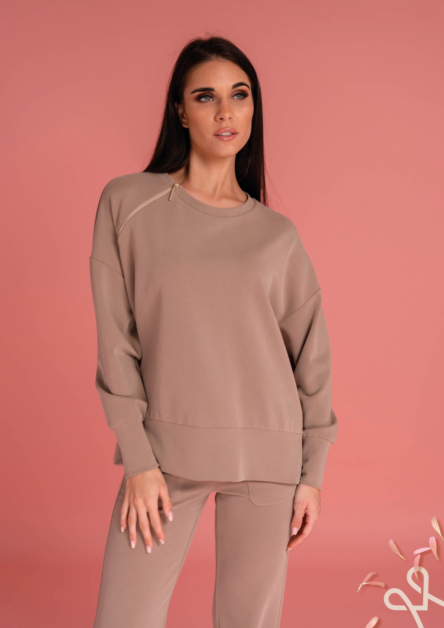 Fango színű, enyhén bő fazonú női felső, egyik oldalt hasítékkal, nyakánál cipzárral és filmnyomással díszítve, amely stílusos és kényelmes tavaszi viseletet biztosít.