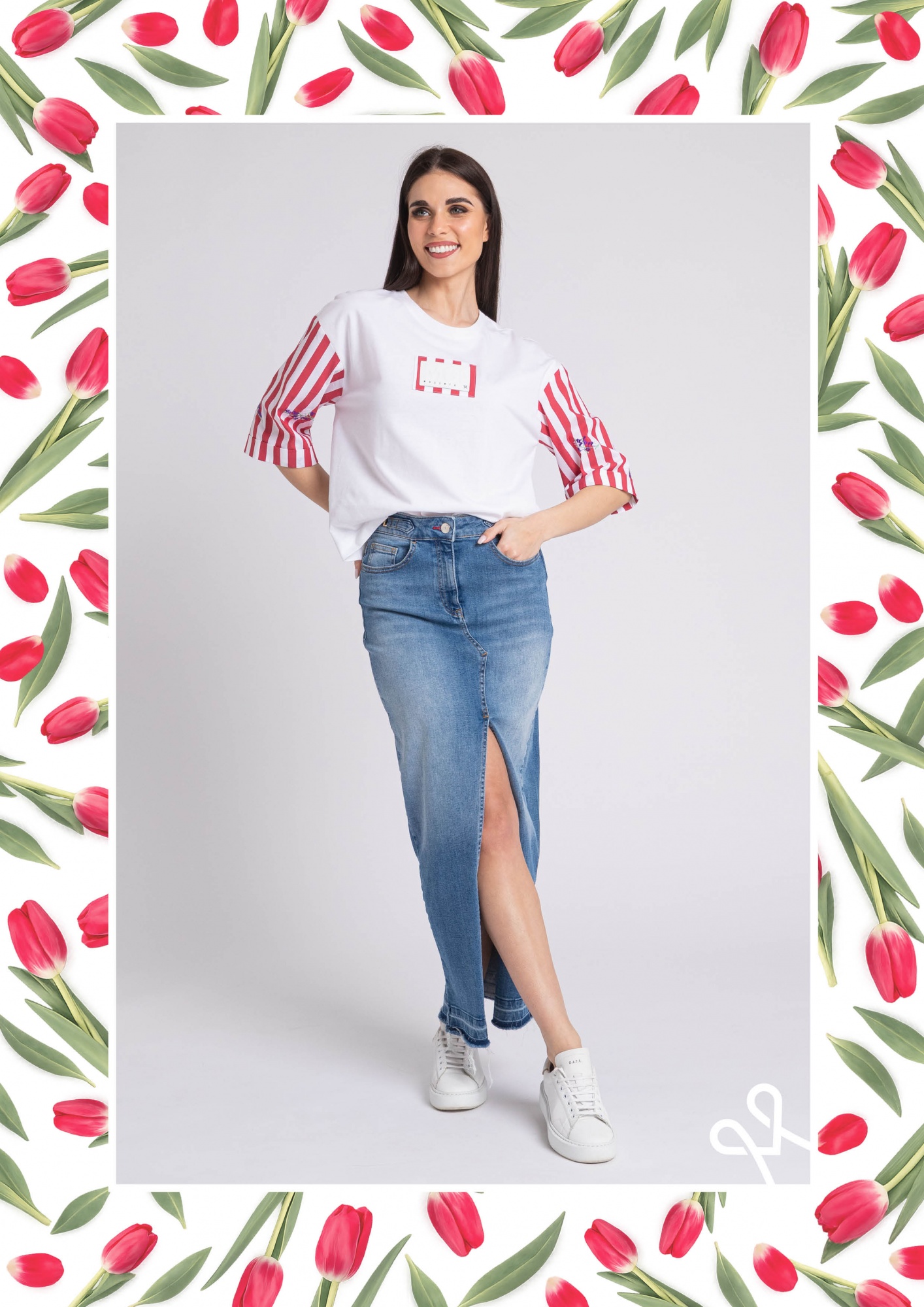 Alakot követő, szűk fazonú nyári farmer szoknya sliccelt elejjel, gombos-cipzáras záródással és praktikus oldalzsebekkel a stílusos megjelenésért.