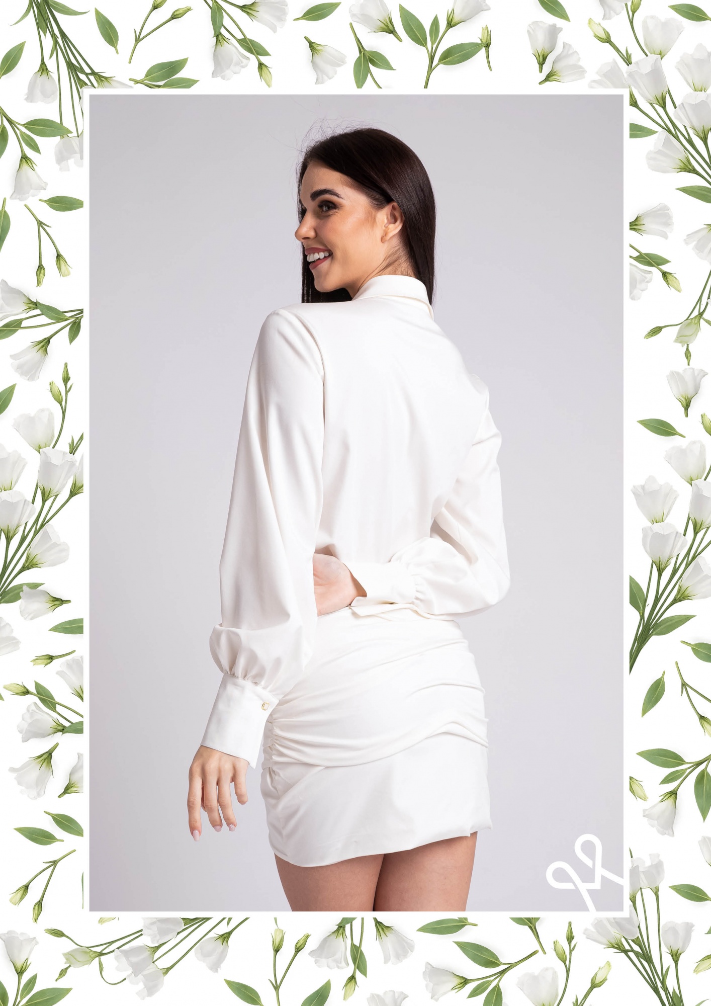 Szűkített szabású, alakot követő női mini ruha kevert szálas anyagból, elején gombos záródással, hosszú ujjal és szoknyarészén húzott kialakítással, amely nőies és stílusos tavaszi viselet.