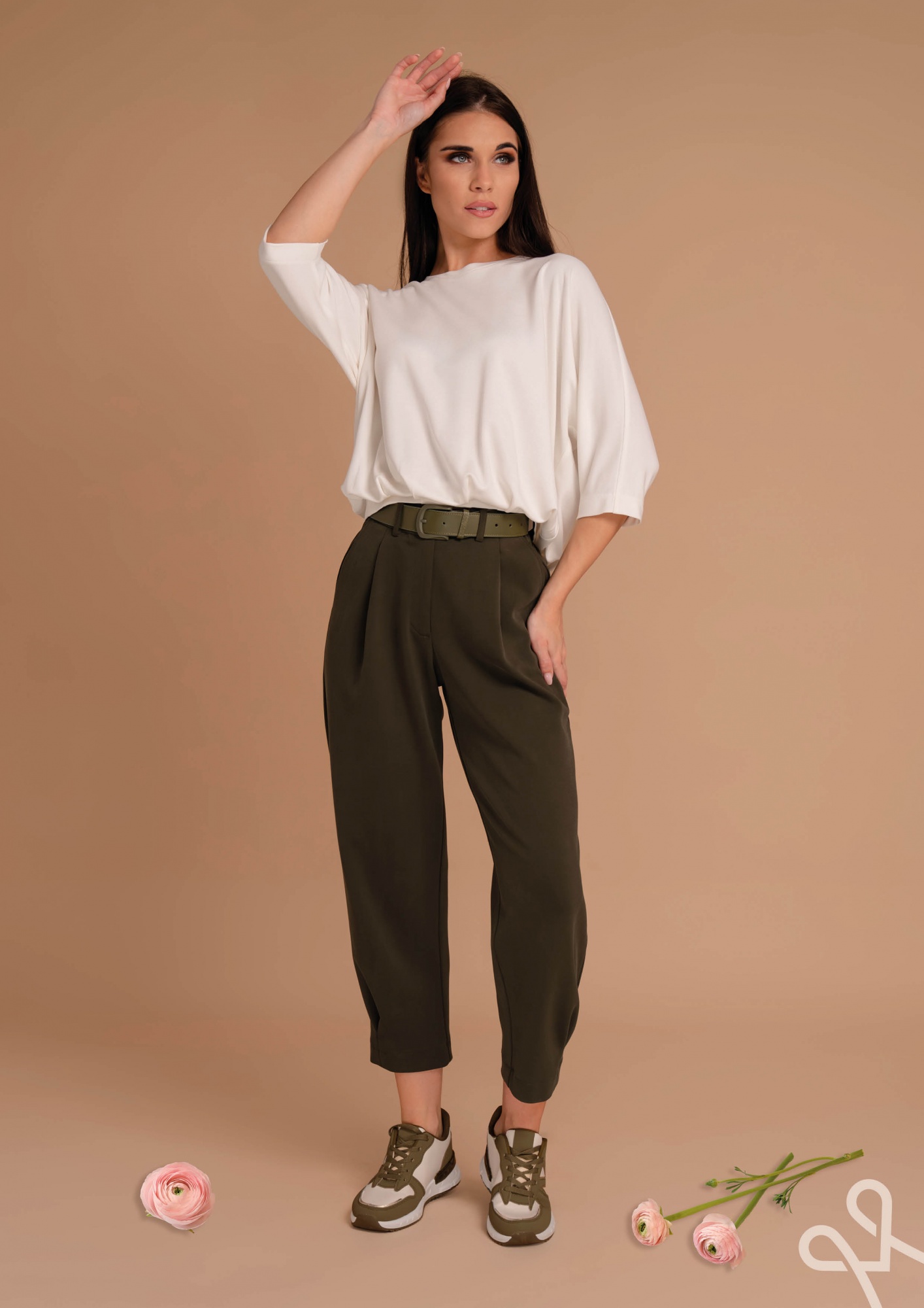 Fehér színű, bővebb, lazább szabású viszkóz-elasztikus női felső kerek nyakkivágással, alján hajtásokkal és gumírozott részlettel, amely kényelmes és stílusos tavaszi megjelenést biztosít.