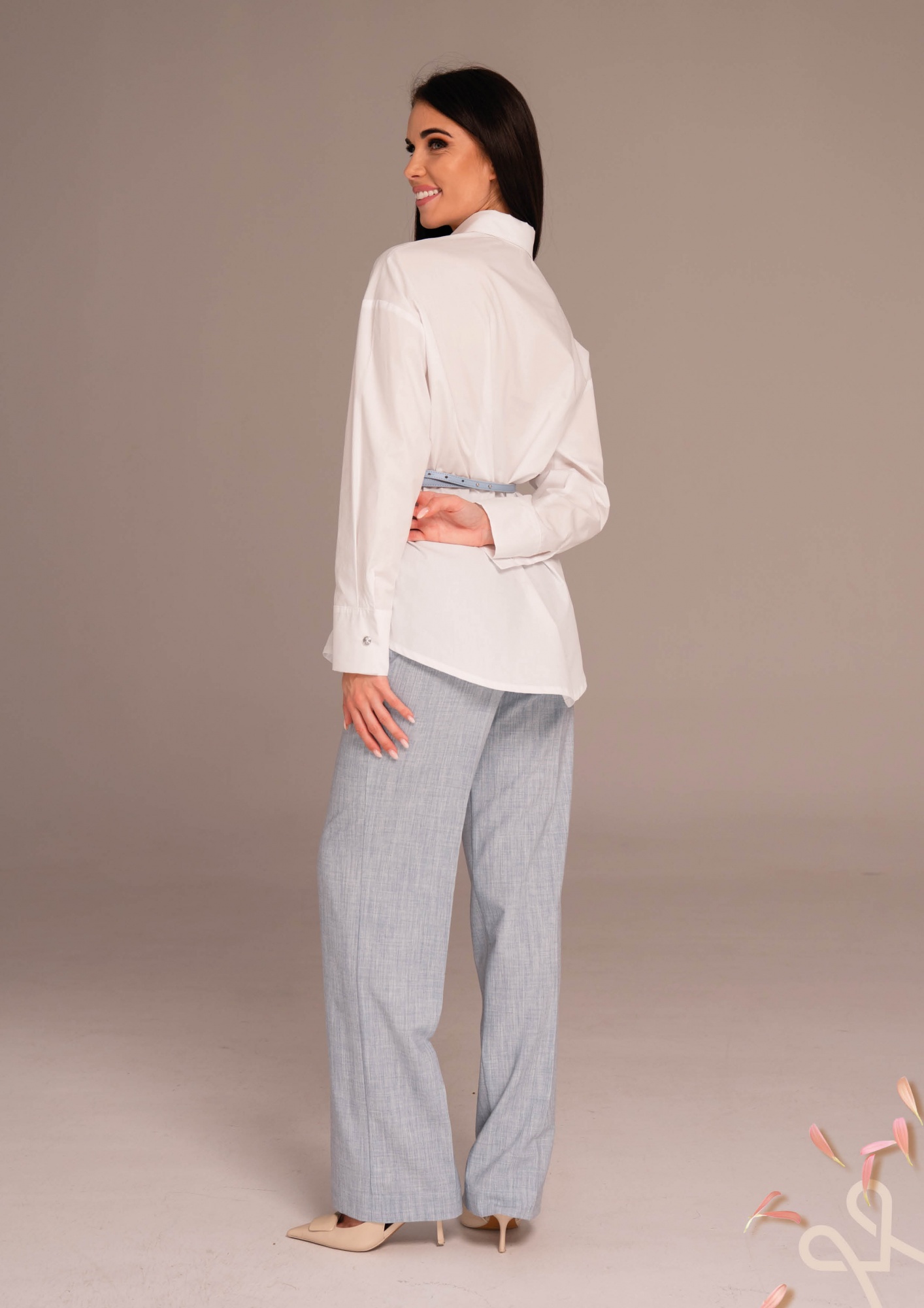 Fehér színű, lazább fazonú női pamut vászon ing elején gombos záródással, klasszikus gallérral és széles, gombolható mandzsettával, amely letisztult és elegáns tavaszi viselet.