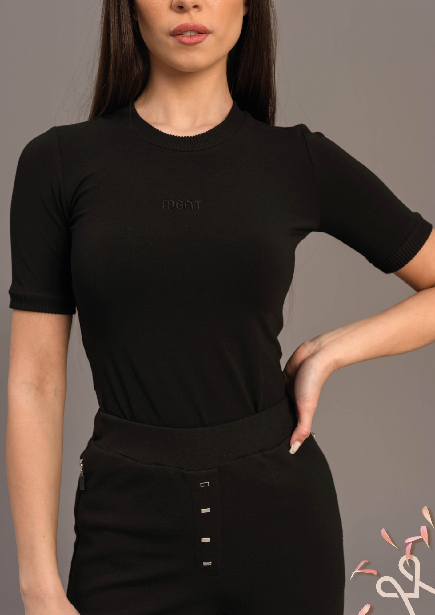 Fekete színű, szűkebb, alakot követő, elasztikus viszkóz póló V-nyakkivágással, bordás anyagbetéttel és elején hímzett márkajelzéssel, amely modern és kényelmes tavaszi viselet.