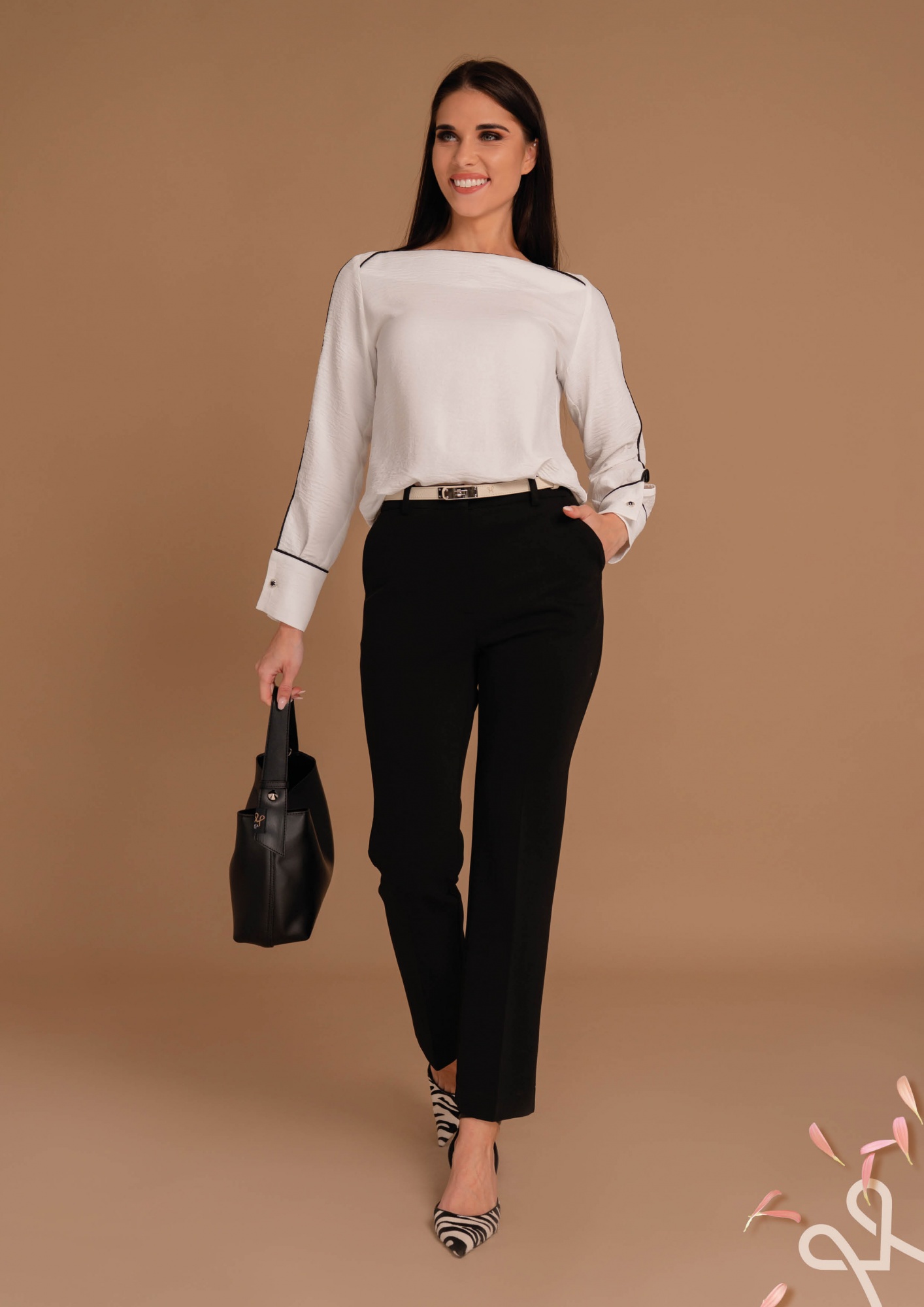 Fekete, egyenes szárú nadrág gombos és cipzáras záródással, praktikus oldalzsebekkel és övbújtatóval a letisztult, időtálló megjelenésért.
