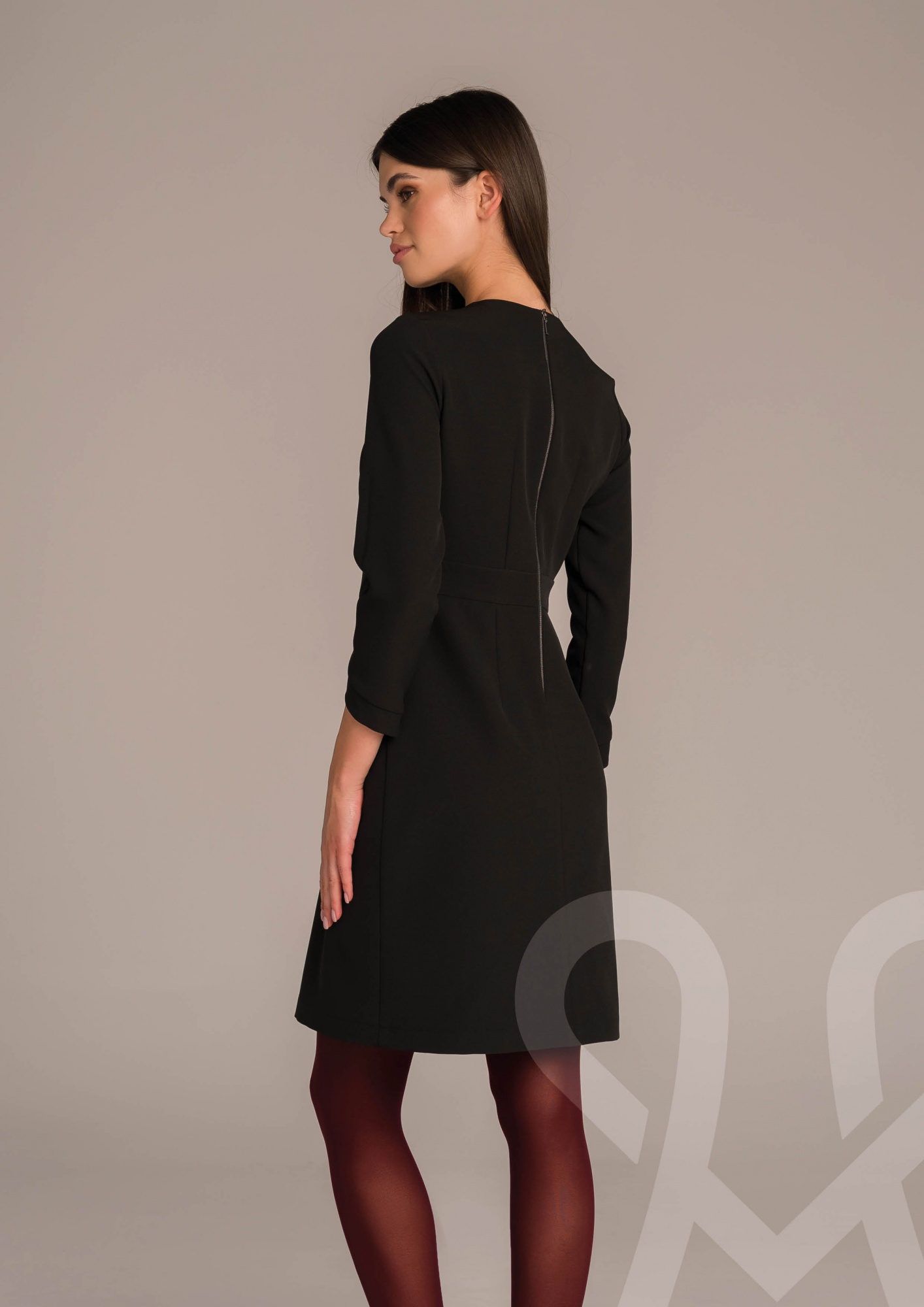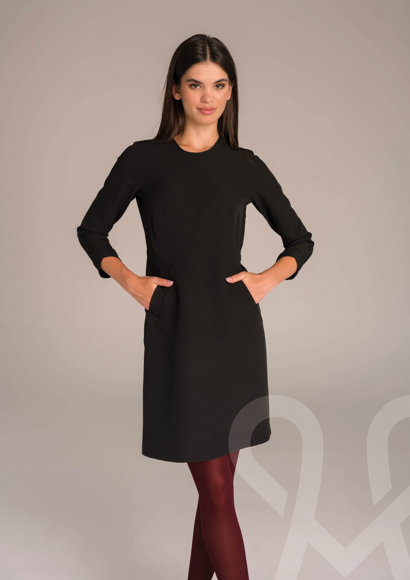 Fekete színű, kevert szálas Magenta ruha, A-vonalú, zsebekkel, térd főlé érő hosszal. Oldalán rávarrt textil Magenta márkajelzés.