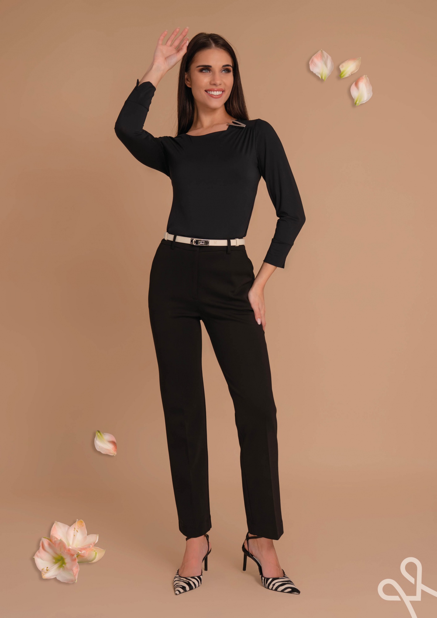 Szűk, alakot követő fekete elasztikus felső elöl díszítéssel és húzott részletekkel, hosszú ujjal a nőies, kiemelő hatásért.