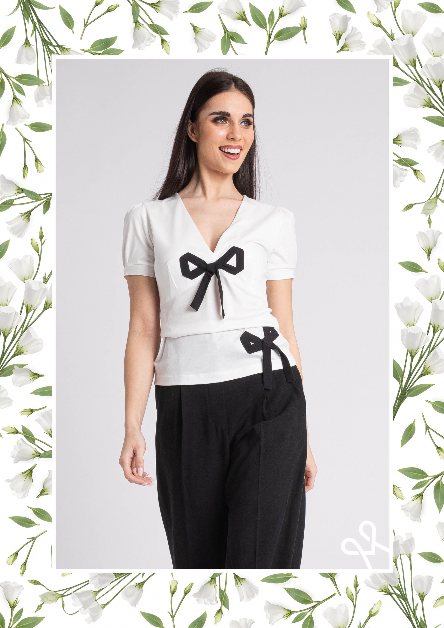 Szűkebb fazonú, alakot követő, elasztikus viszkóz felső mell alatt szabásvonallal formázva, elején V-kivágással, rövid ujjal és masni díszítésekkel a nőies megjelenésért.