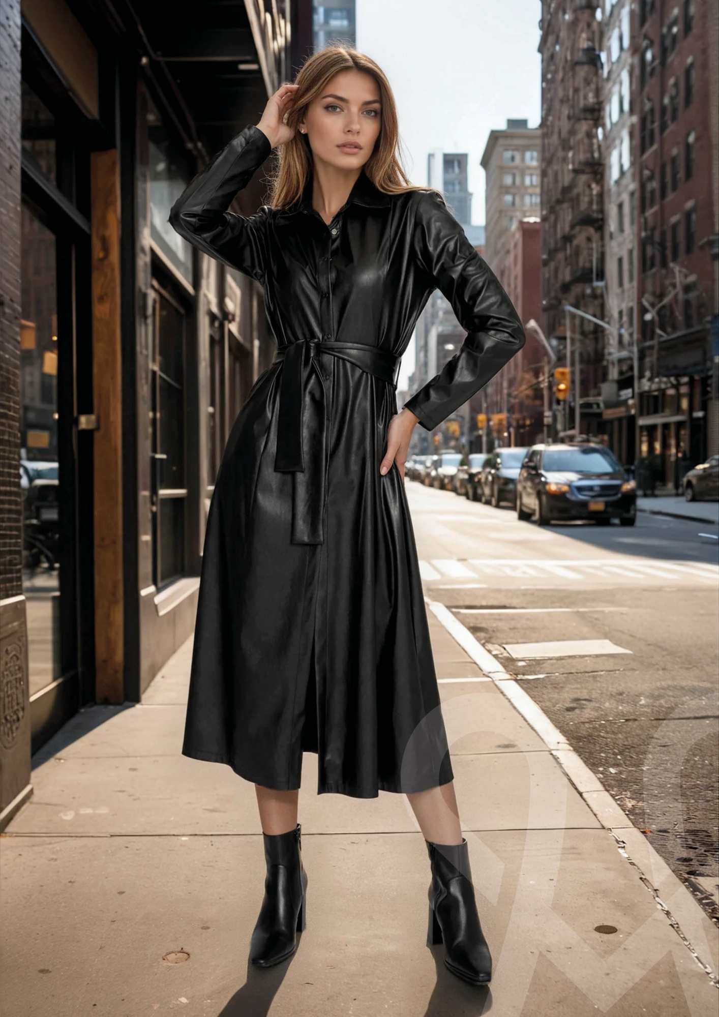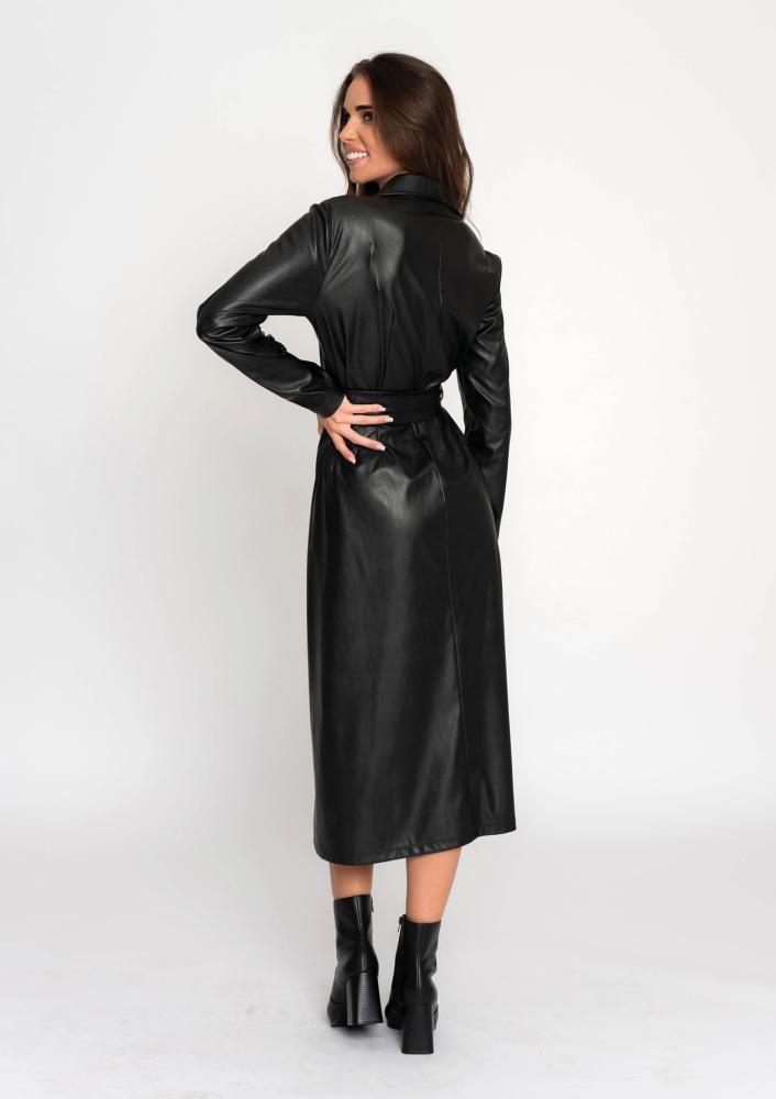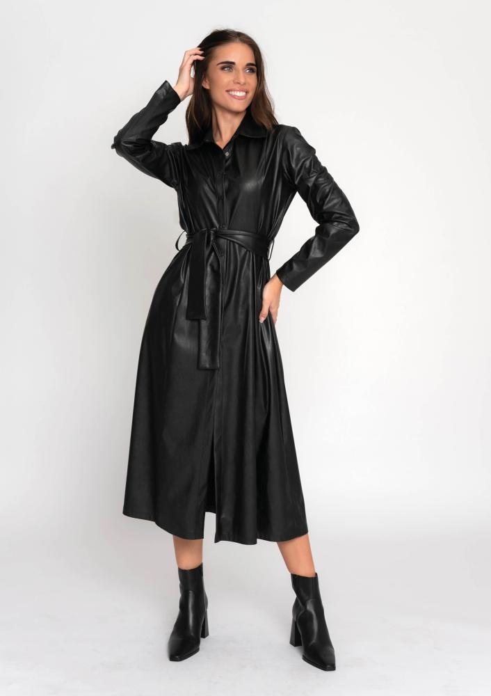 Alakot követő, fekete színű műbőr ingruha térd alá érő hosszal, hosszú ujjal, kihajtós gallérral és elöl gombos záródással, amely határozott, mégis nőies megjelenést biztosít.