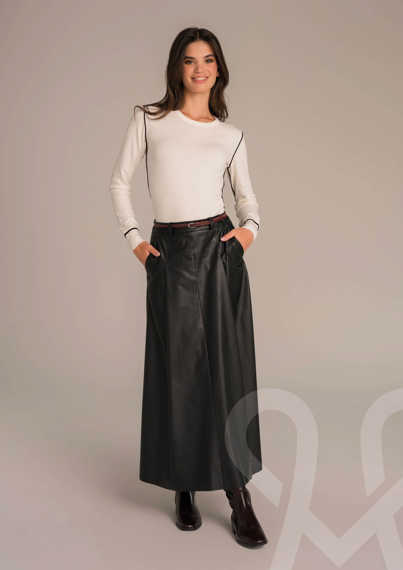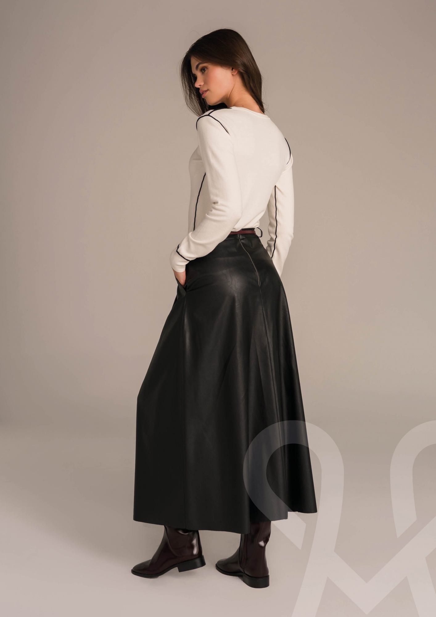 Fekete színű, bokáig érő műbőr szoknya, amelyet hajtások, oldalzsebek és a derekán található gombolható pántrészletek tesznek különlegessé, modern és karakteres megjelenést nyújtva.