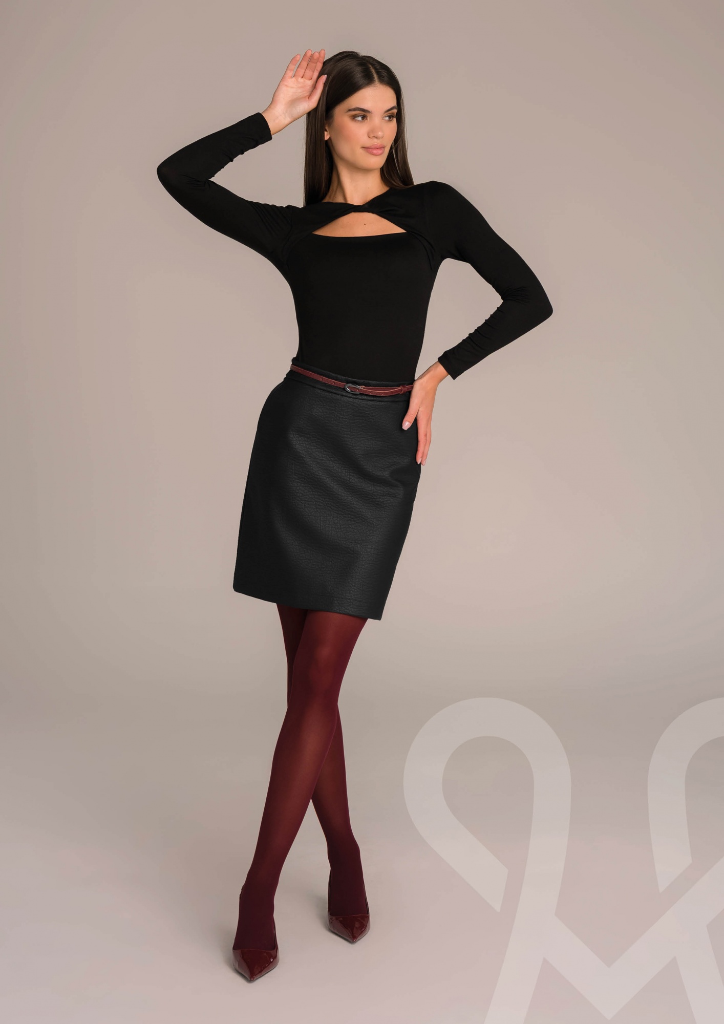 A-vonalú, térd fölöttig érő, fekete színű Magenta műbőr szoknya, zsebekkel, hátán cipzárral záródik.
