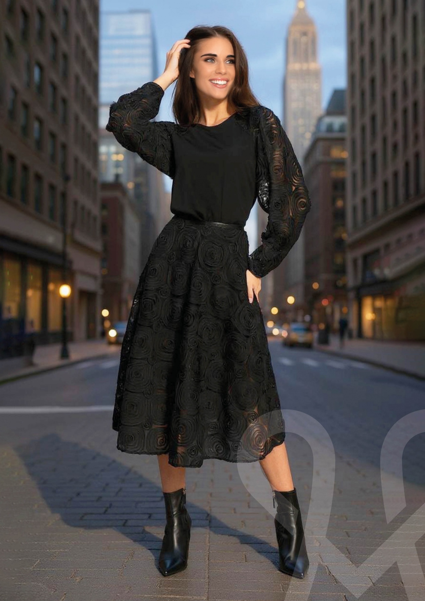Lazább szabású, raglán ujjú fekete felső kerek nyakkivágással és finom tüll betéttel az ujjakon, a lezser elegancia jegyében.