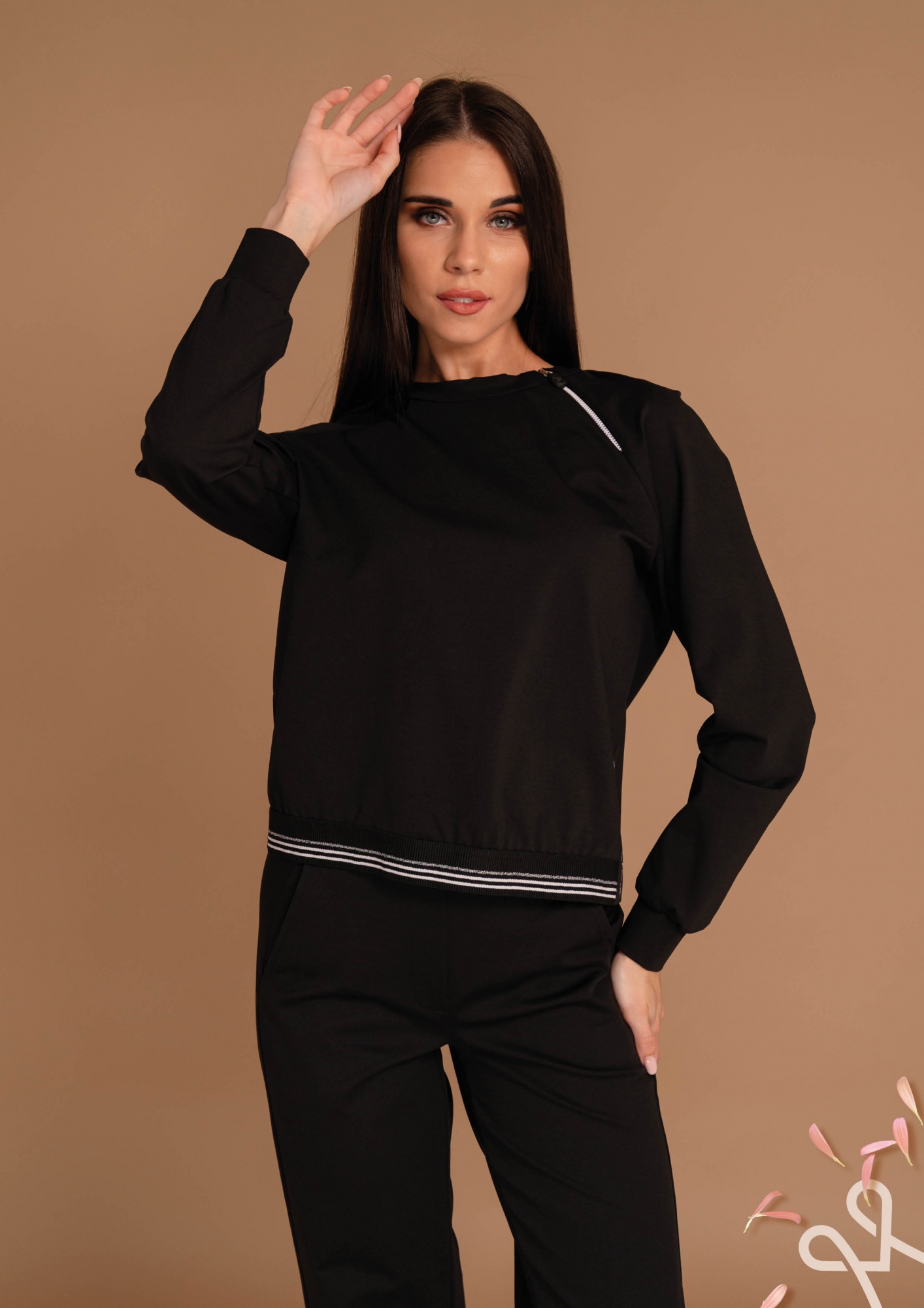 Lazább, sportos fekete elasztikus felső nyakrészen cipzárral és gumis aljrésszel a kényelmes, modern megjelenésért.