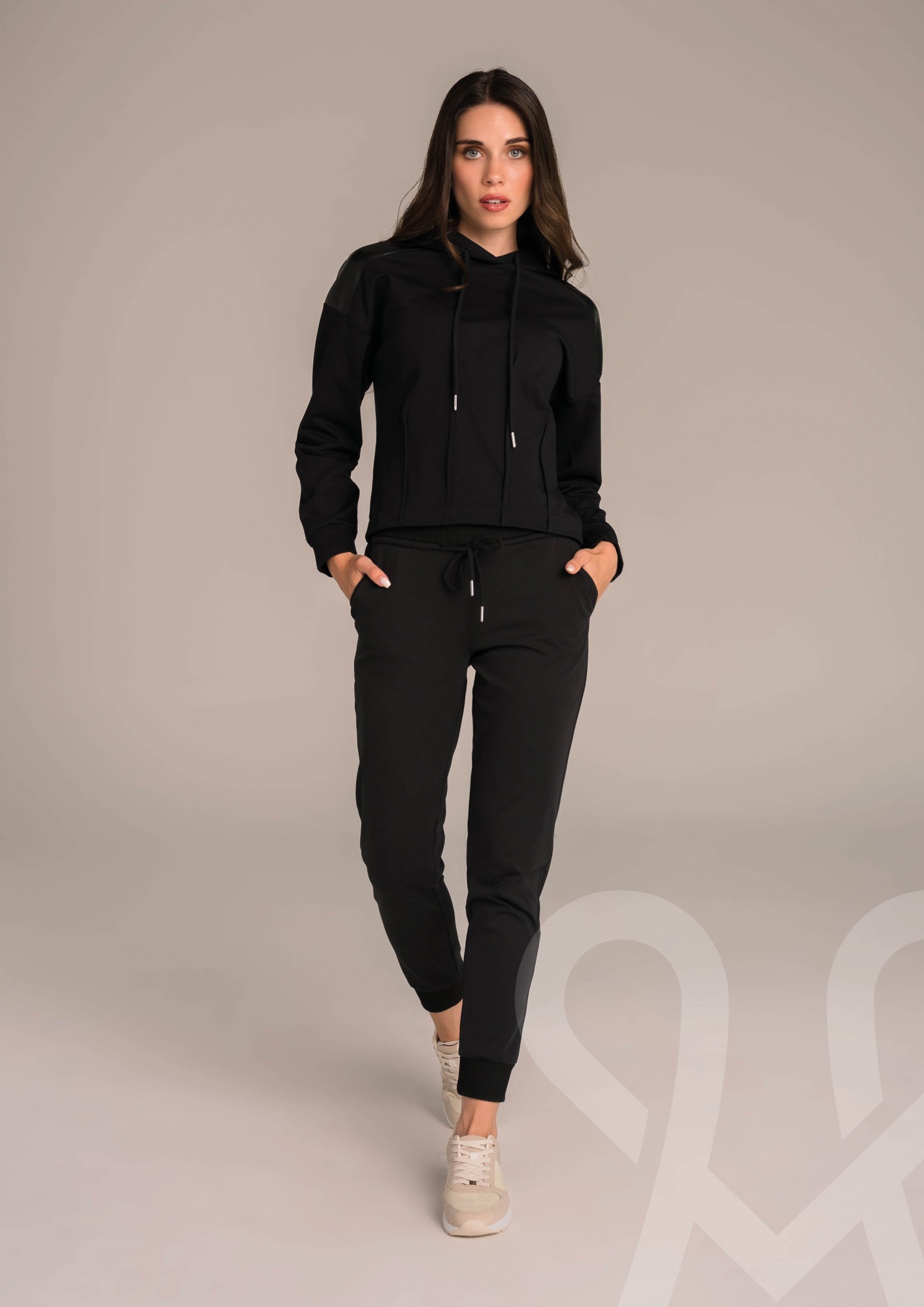 Fekete színű, sportos Magenta nadrág, szűkülő szárú, derékrészen széles passzéval és megkötővel, oldalán zsebekkel.