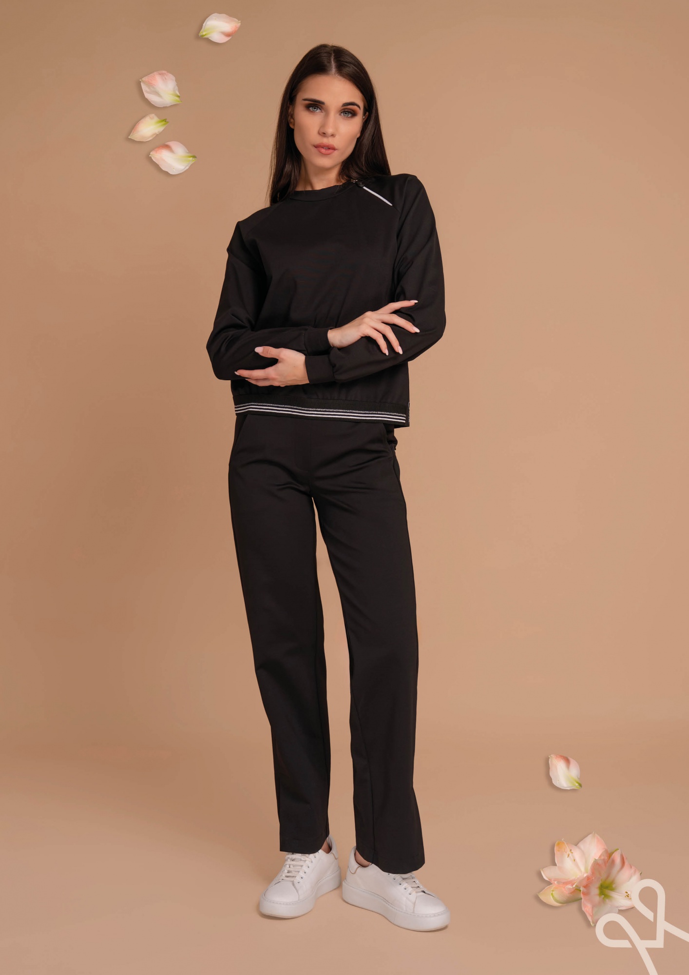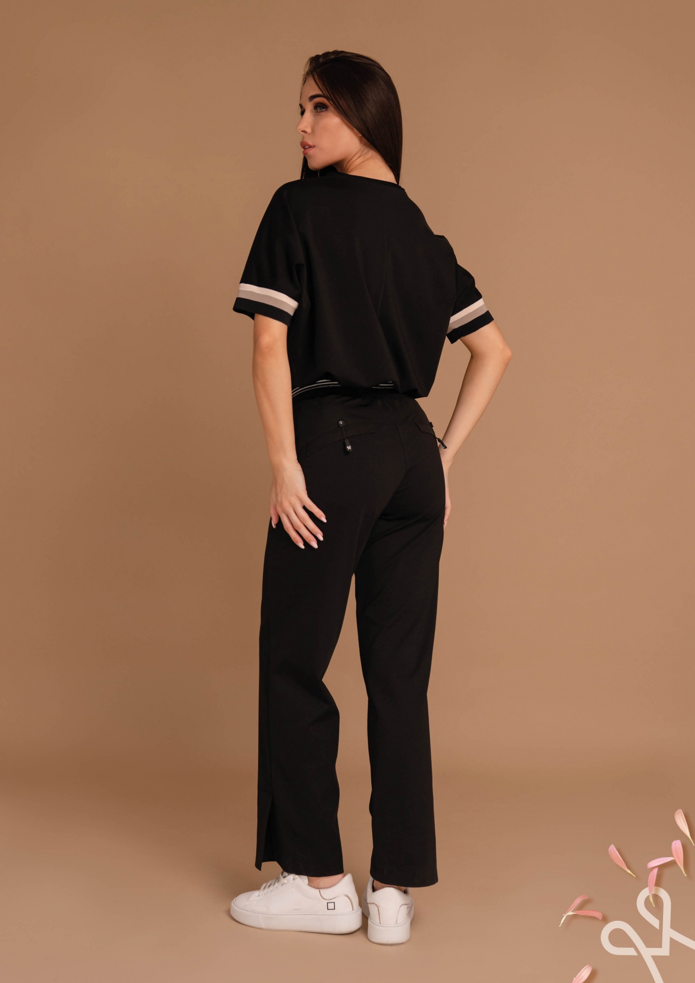 Bővebb szárú, fekete elasztikus nadrág gumis derékrésszel és oldalzsebekkel a kényelmes, laza mindennapi megjelenésért.