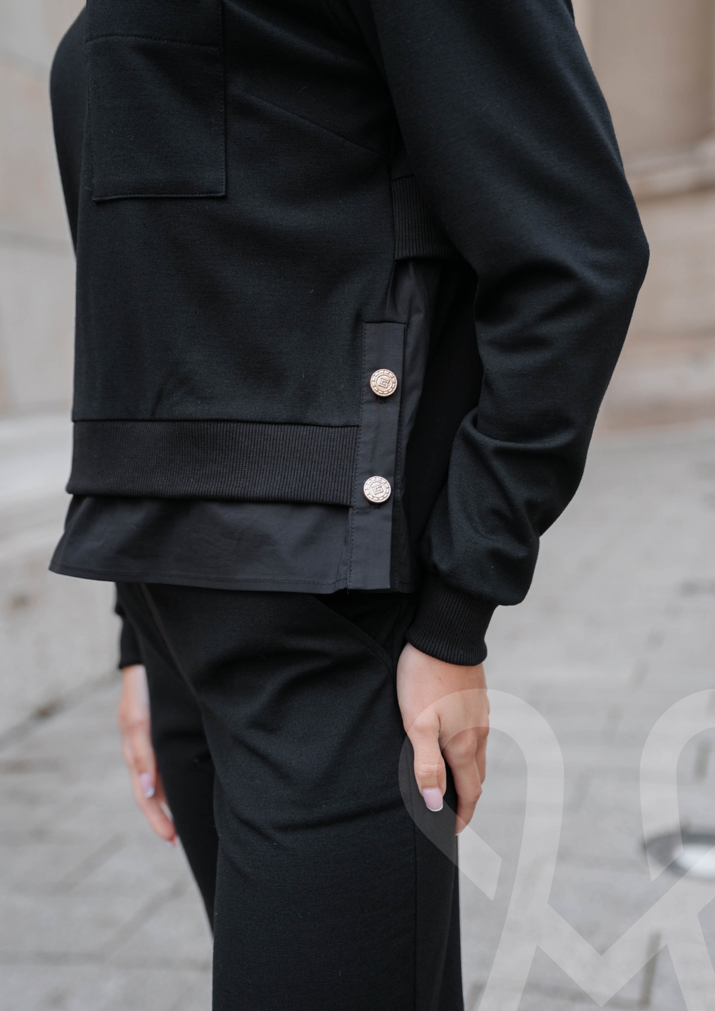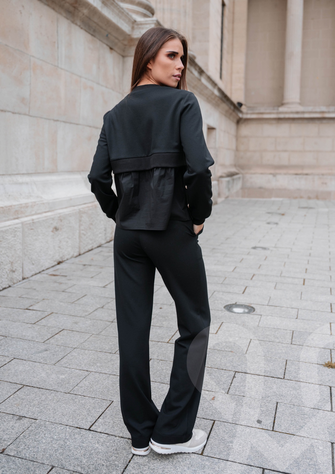 Fekete színű, bővebb, lazább szabású sportos pulóver, melyet az elején található foltzseb, a passzés részletek és a kerek nyakkivágás tesznek kényelmesen stílusossá.