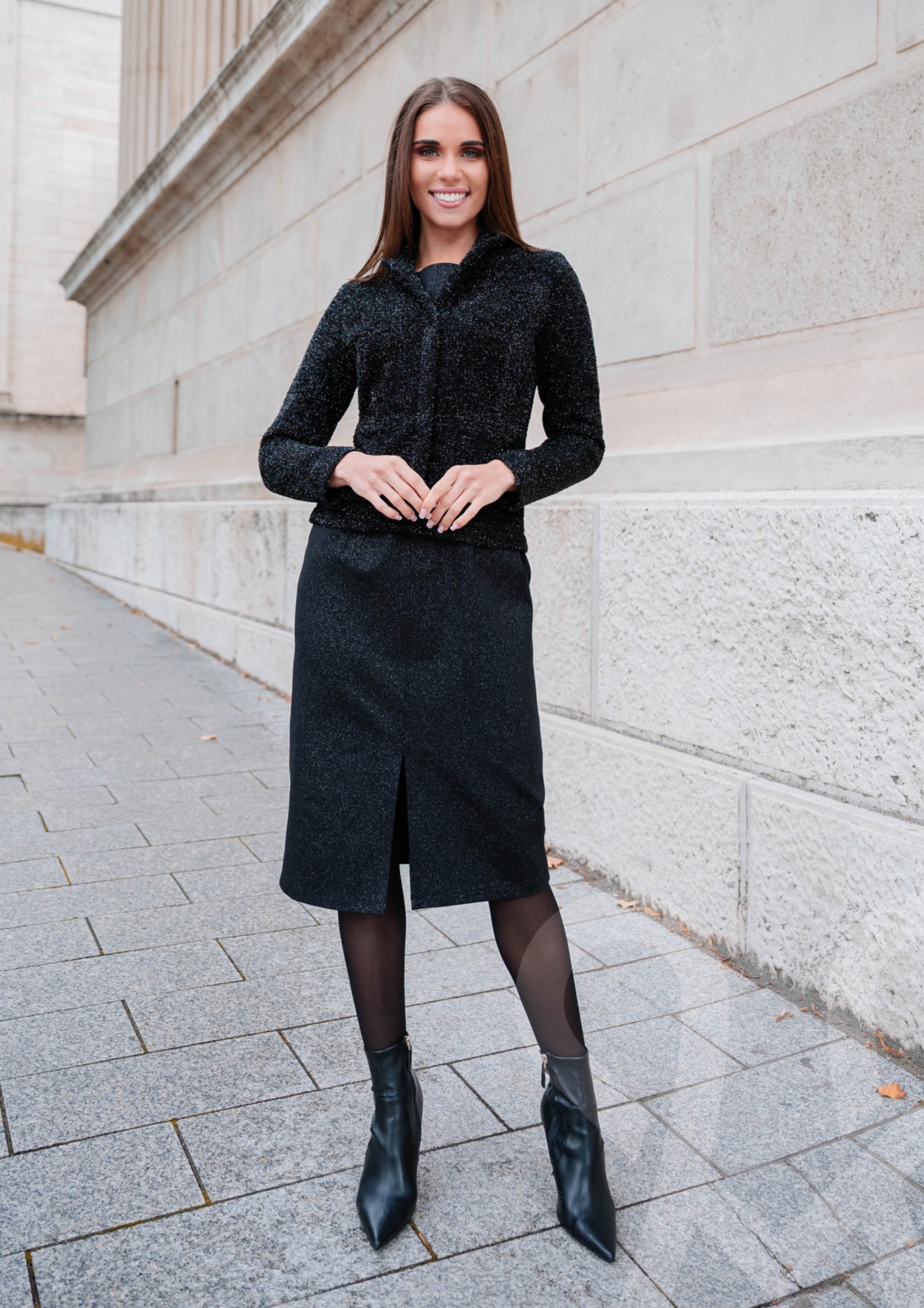 Elegáns, szűkebb fazonú fekete zakó kevert szálas anyagból, fazonos gallérral és cipzáras előlappal a modern, kifinomult megjelenésért.