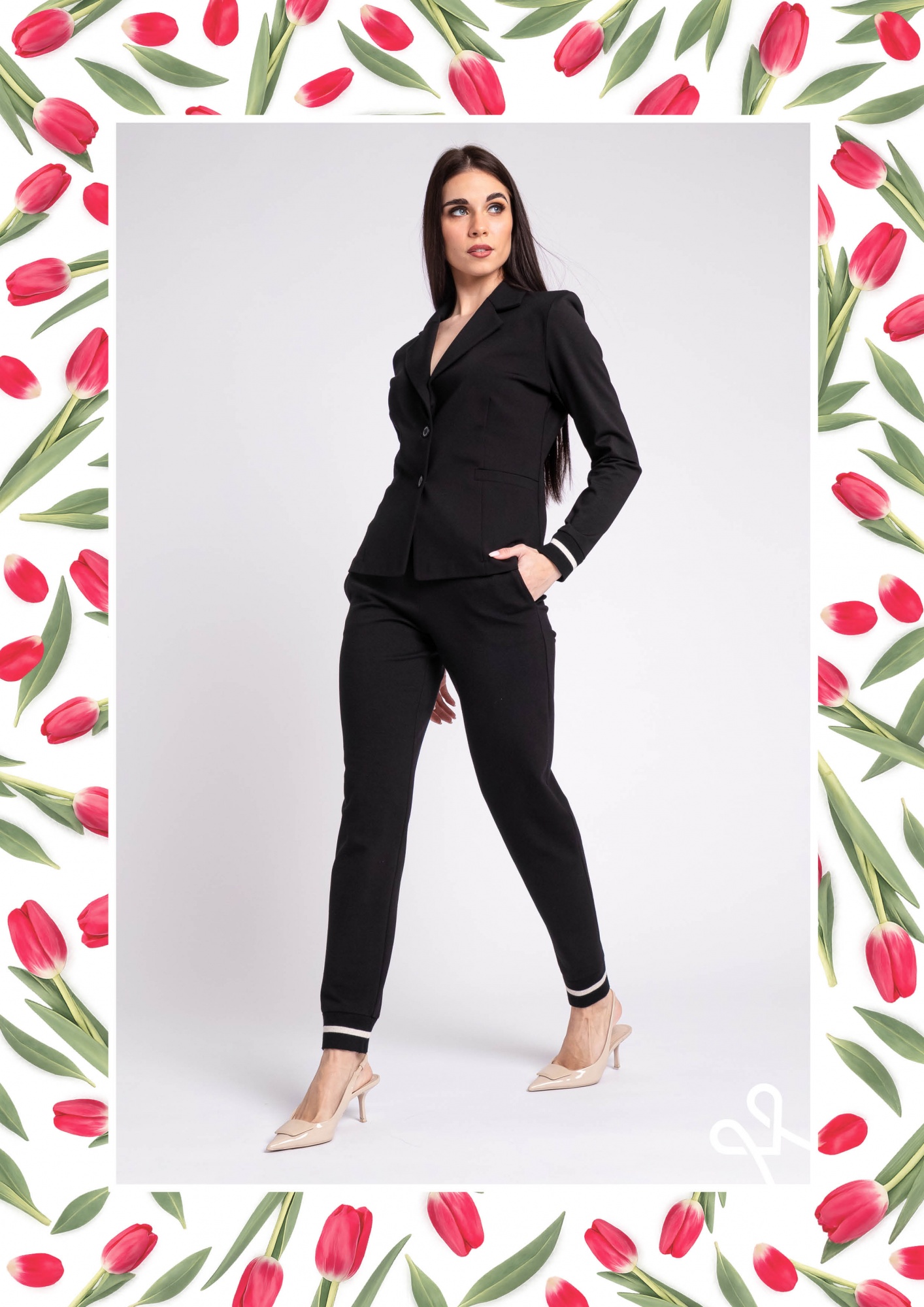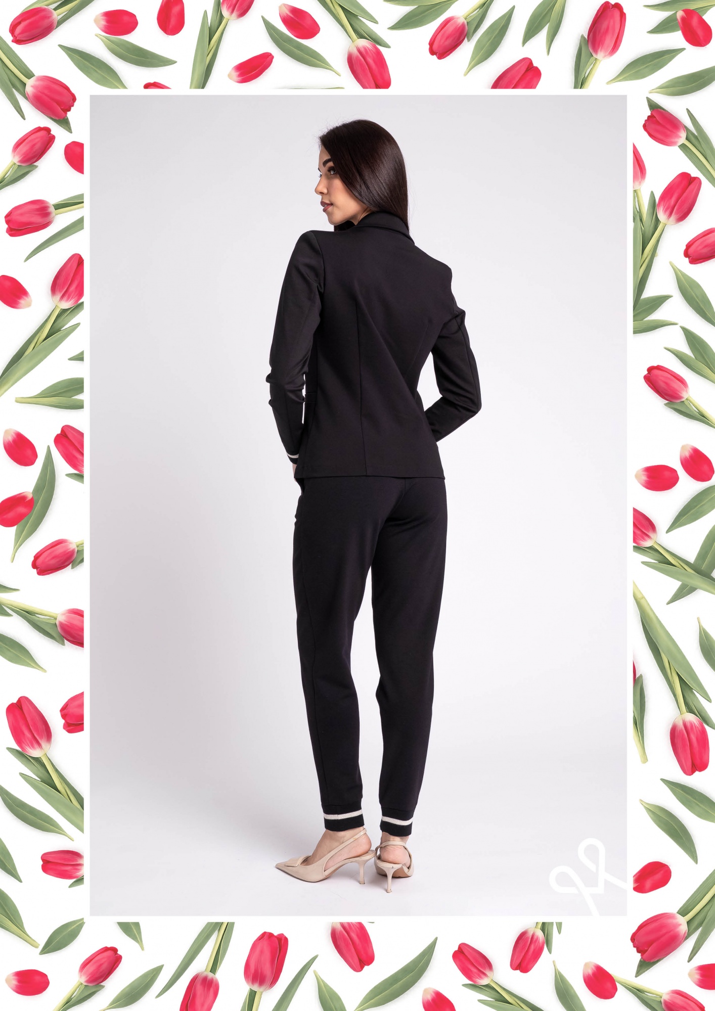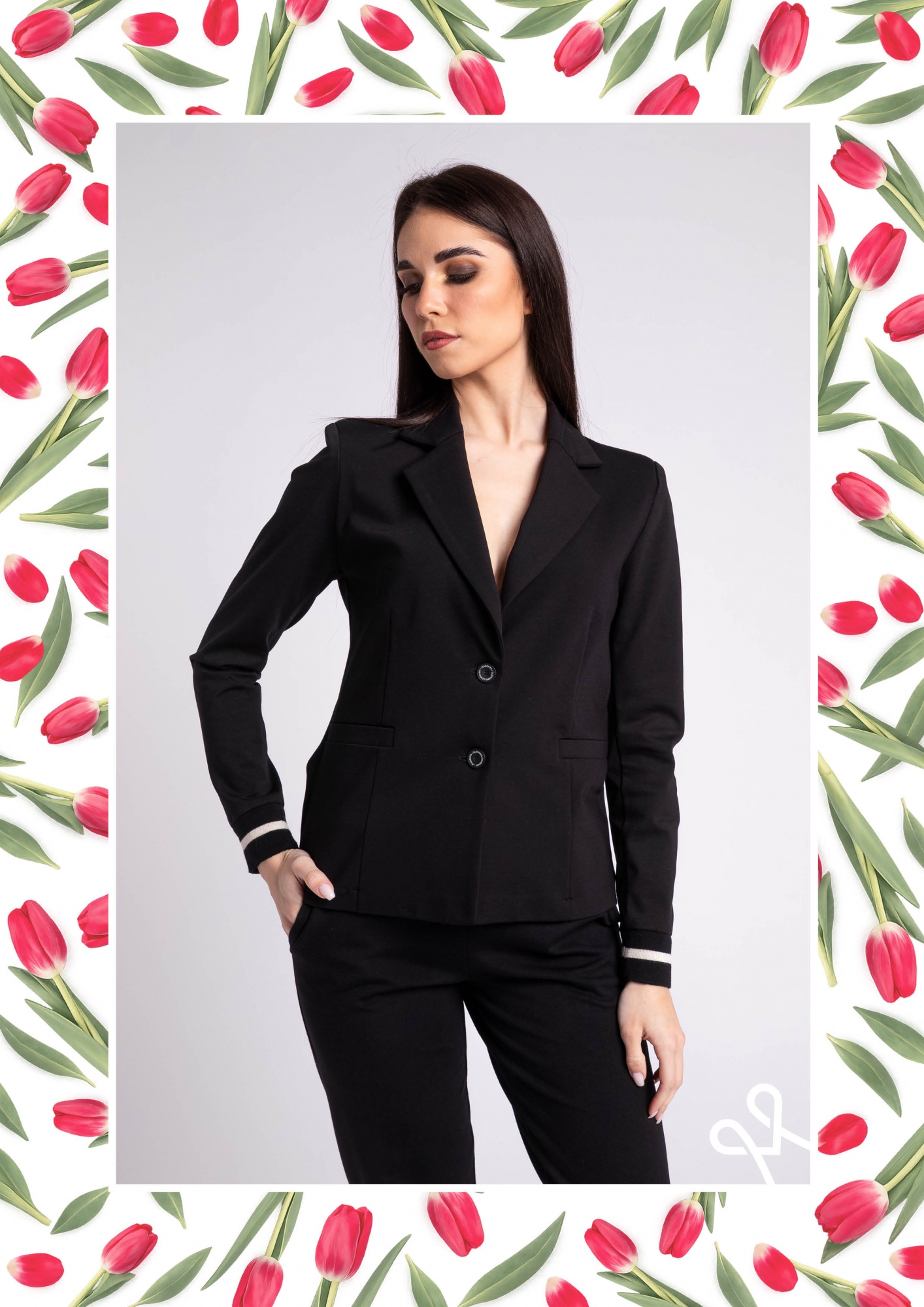 Alakot követő, sportos fazonú fekete elasztikus zakó, elegáns kihajtós gallérral és passzés ujjvéggel a modern megjelenésért.