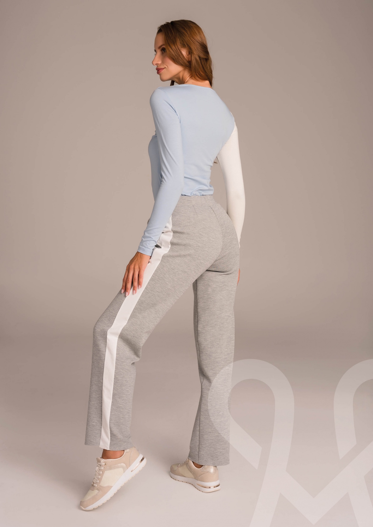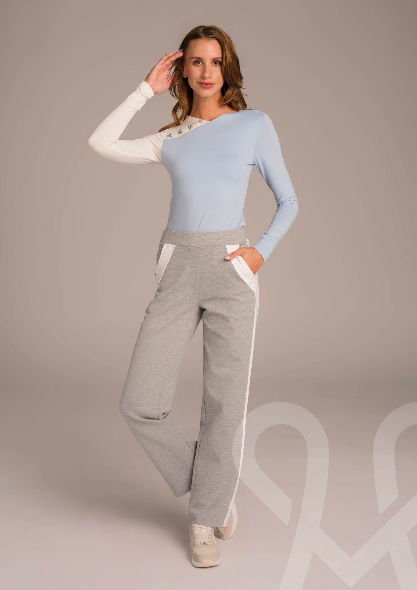 Szűkebb fazonú, felhőkék színű Magenta elasztikus viszkóz felső enyhe V-kivágással, fehér ujjakkal és elején filmnyomott márkajelzéssel a modern, sportos megjelenésért.