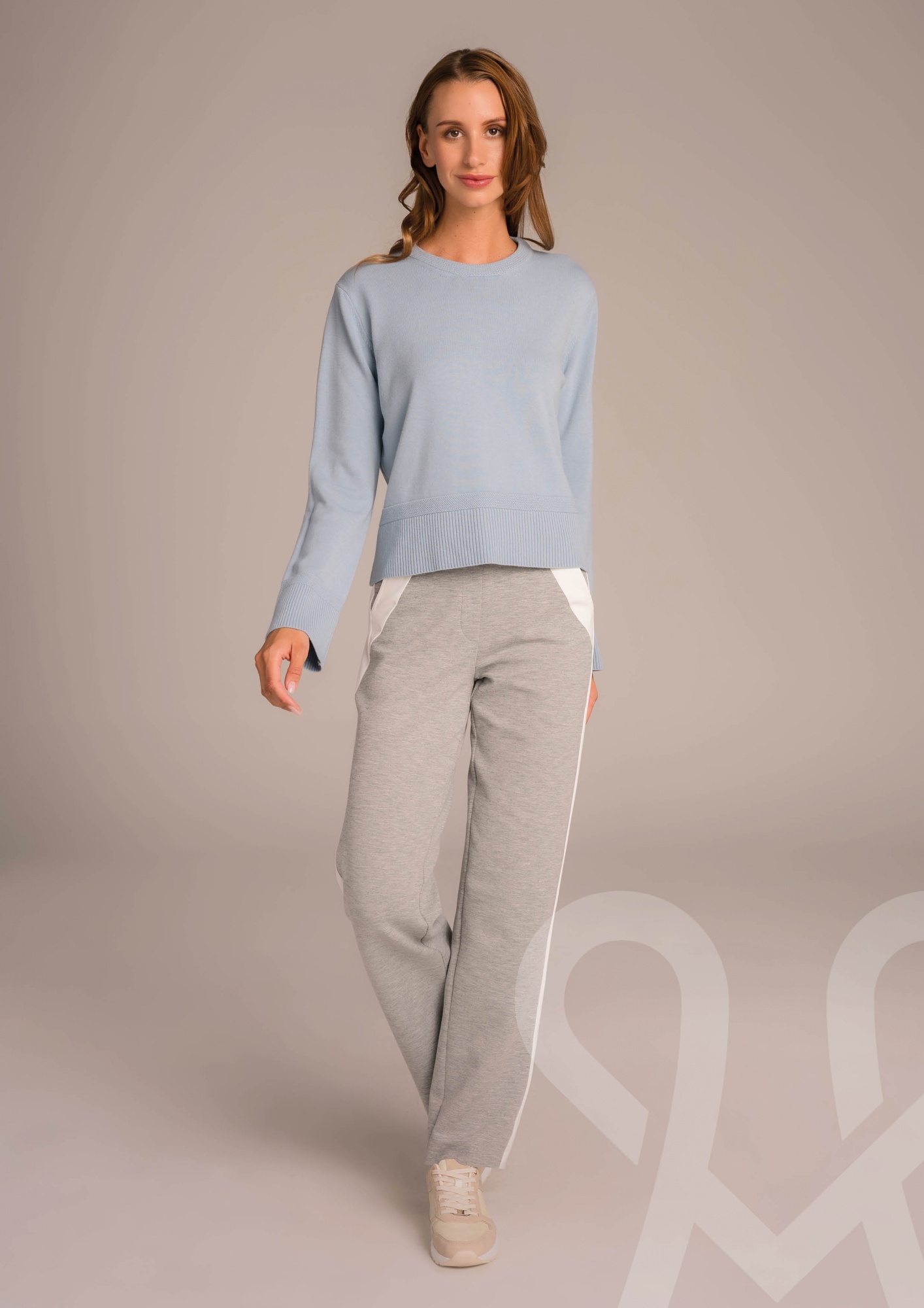 Elasztikus kötött anyagból készült, laza szabásvonalú, felhőkék színű Magenta pulóver, kerek nyakkivágással.