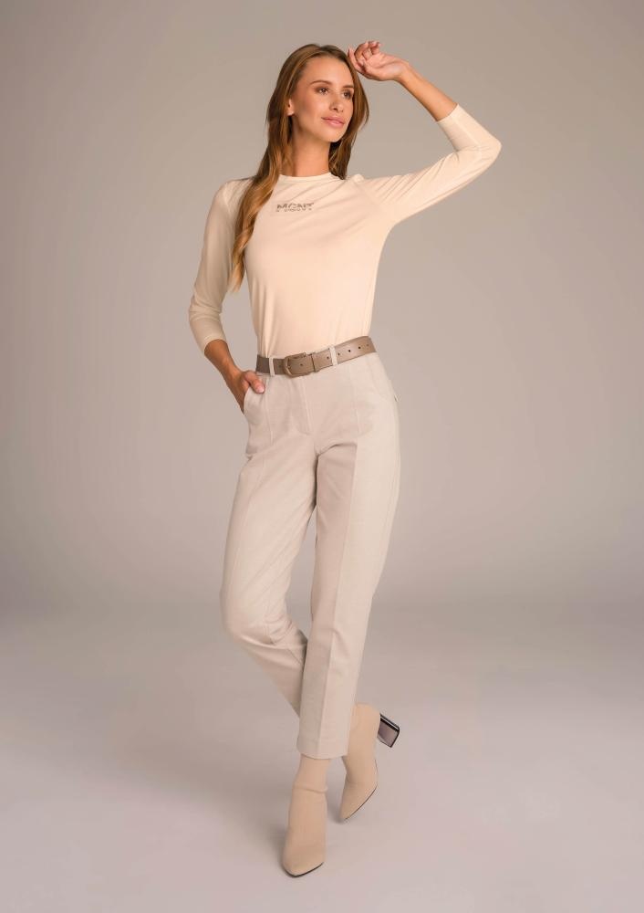 Elasztikus viszkóz anyagból készült, szűkített szabásvonalú, vaj színű Magenta felső, elején hímzéssel és strasszokkal díszítve.