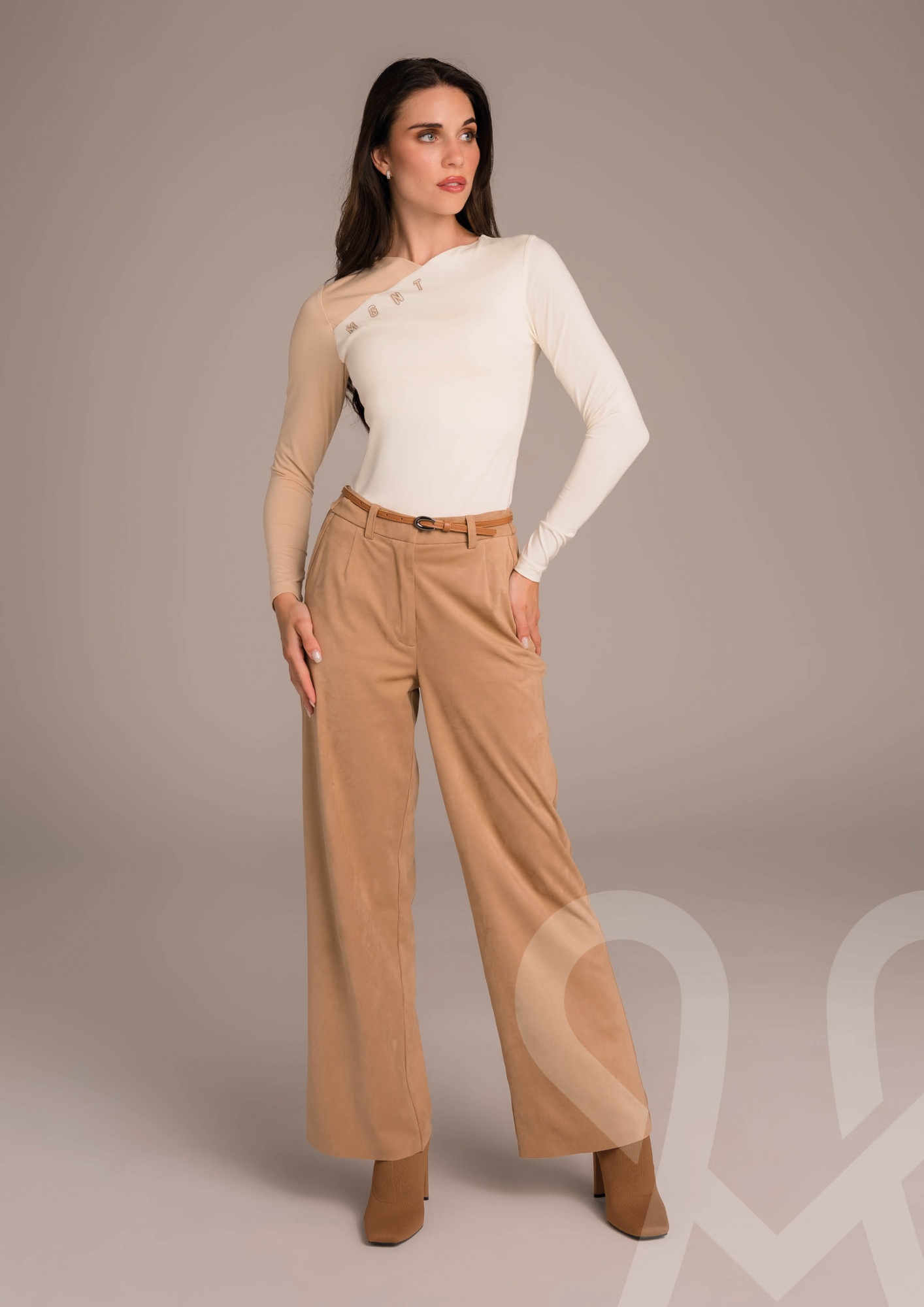 Szűkebb fazonú, vaj színű Magenta elasztikus viszkóz felső enyhe V-kivágással, fehér ujjakkal és elején filmnyomott márkajelzéssel a modern, sportos megjelenésért.